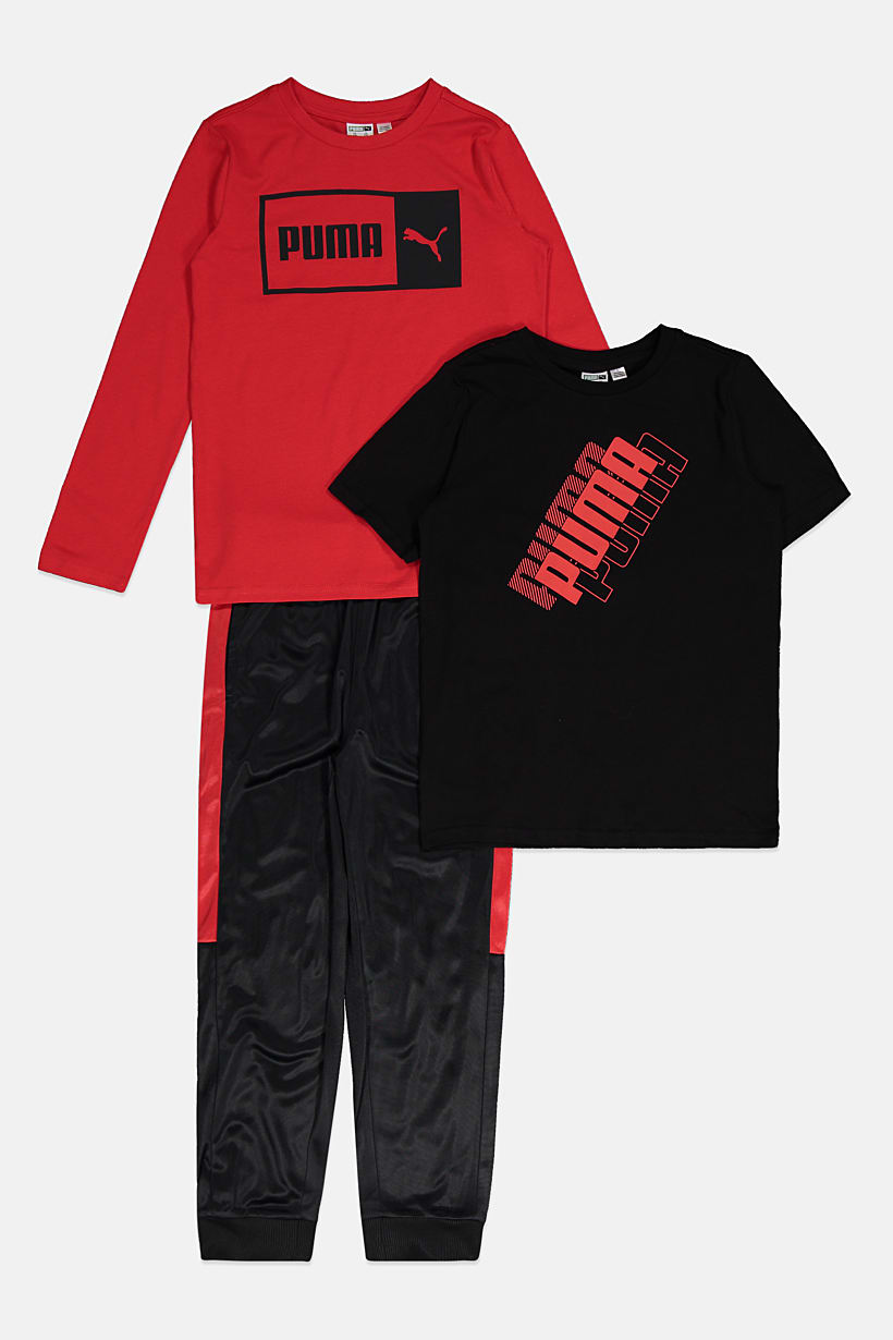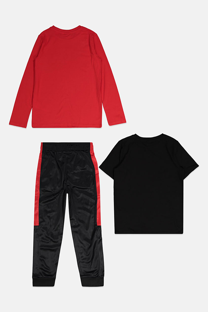 | sub_Categories | Boys Fashion, Boys Sportswear, kids boy 3 pcs brand logo graphic tee and pants set red black |