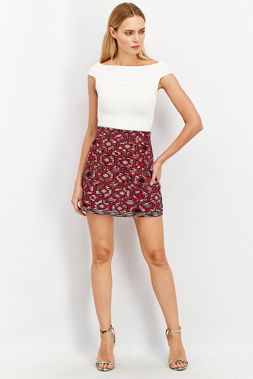 | descriptionOriginal | Bottom Hem : Elasticized, Care : Machine washable, Fit : Regular fit, Size shown : International, Type of Skirt : Mini skirt, Bottom Closure : Zipper fly, Bottom Style/Pattern : No Pocket, Disclaimer : Product color may slightly vary due to photographic lighting sources or your monitor settings., Fabrics : 52% Viscose, 48% Polyamide, Occasion : Casual, Pattern & Print : Allover print, Color Family : Red, |