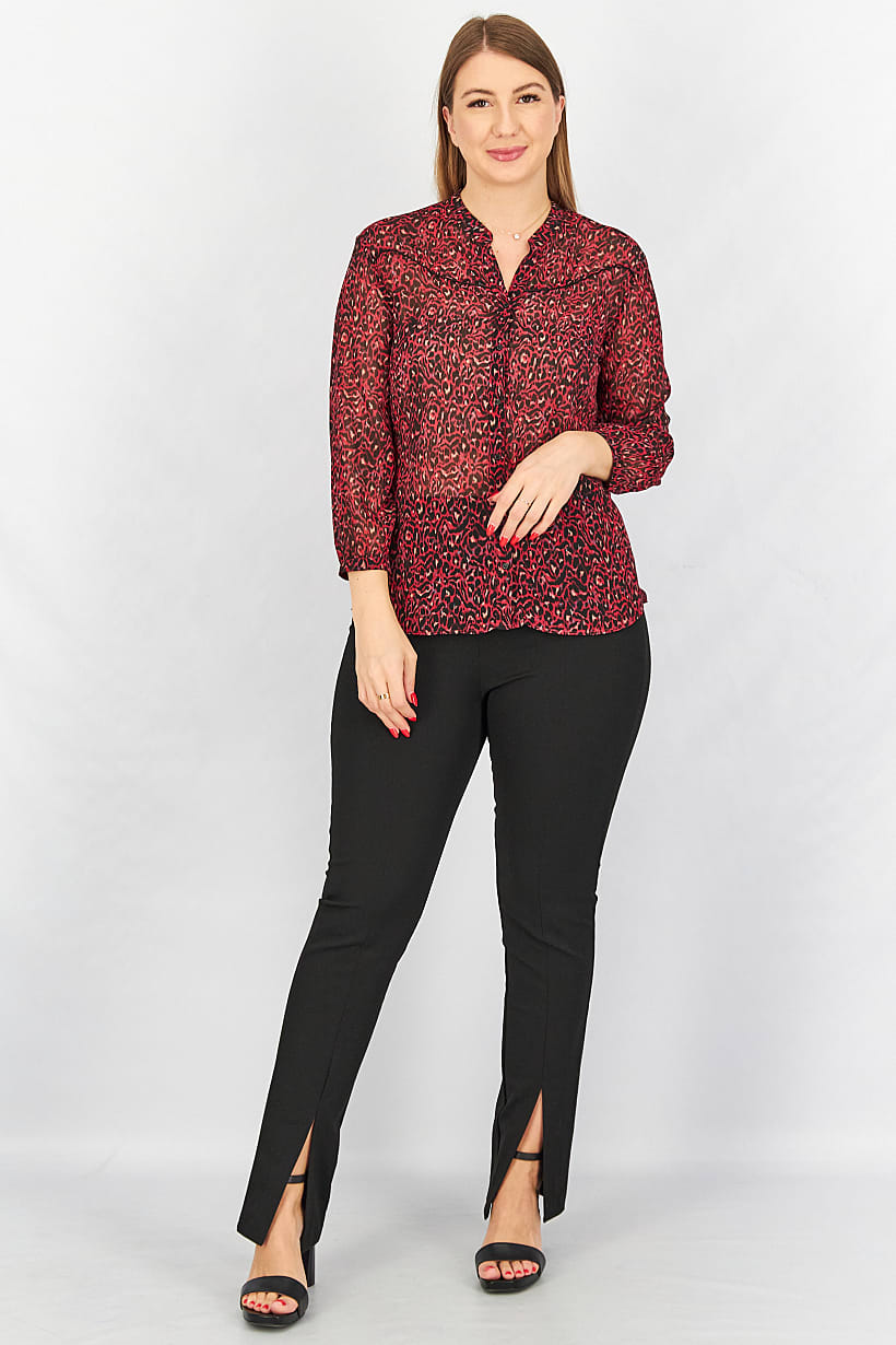 Red and black printed top with split neck and long sleeves for women.