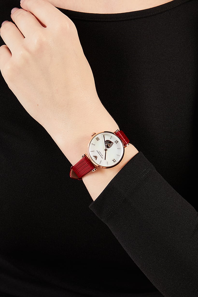 This product features a round dial with a glass window and Roman numeral display. It is an ideal gift for women and has a red leather strap with a buckle closure. The watch is analog and water-resistant. The dial is white with a red color family. Please note that the product color may vary slightly due to lighting or monitor settings.