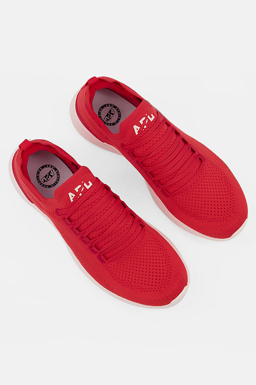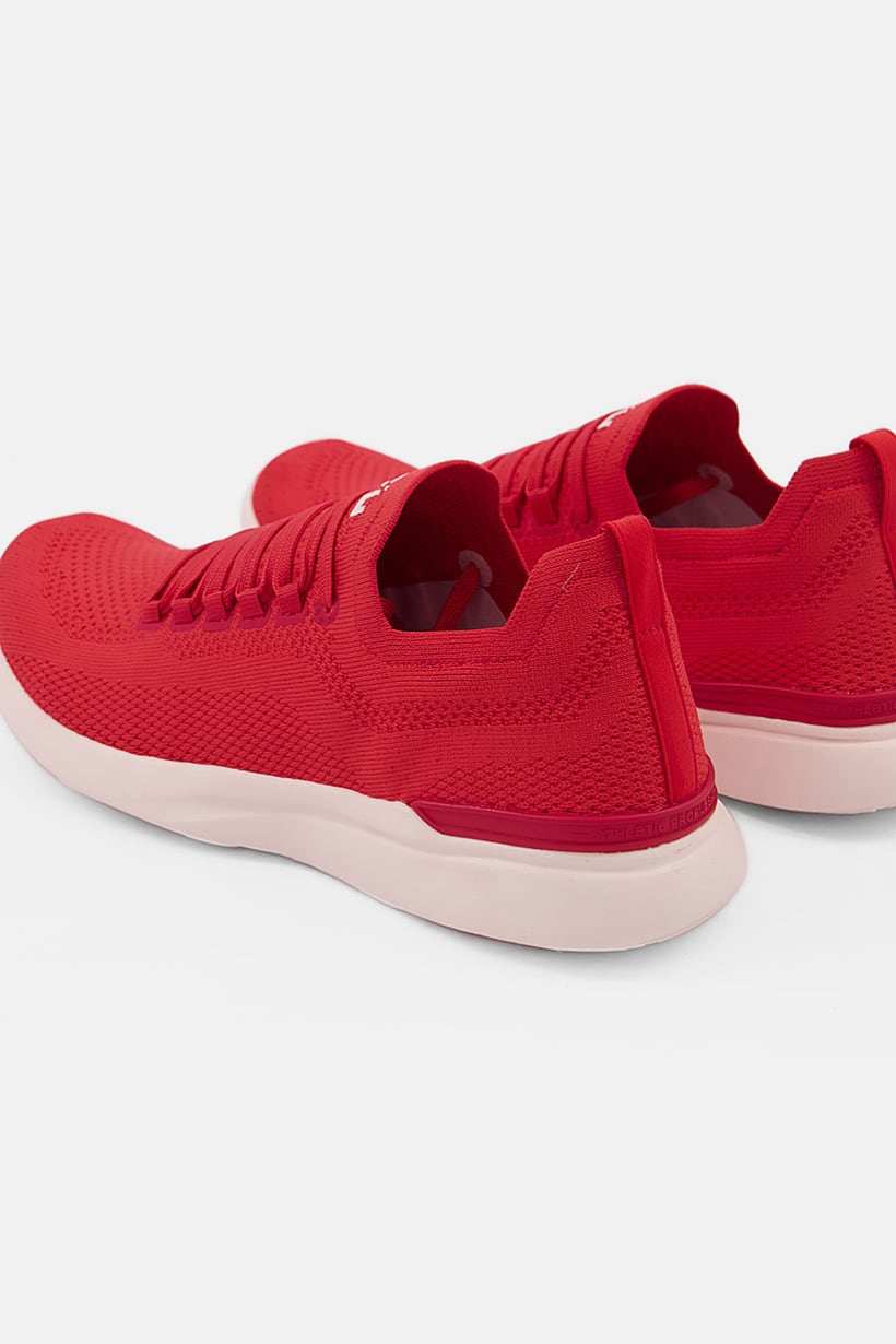 Red and light pink lace-up running shoes for women with Techloom Breeze technology.