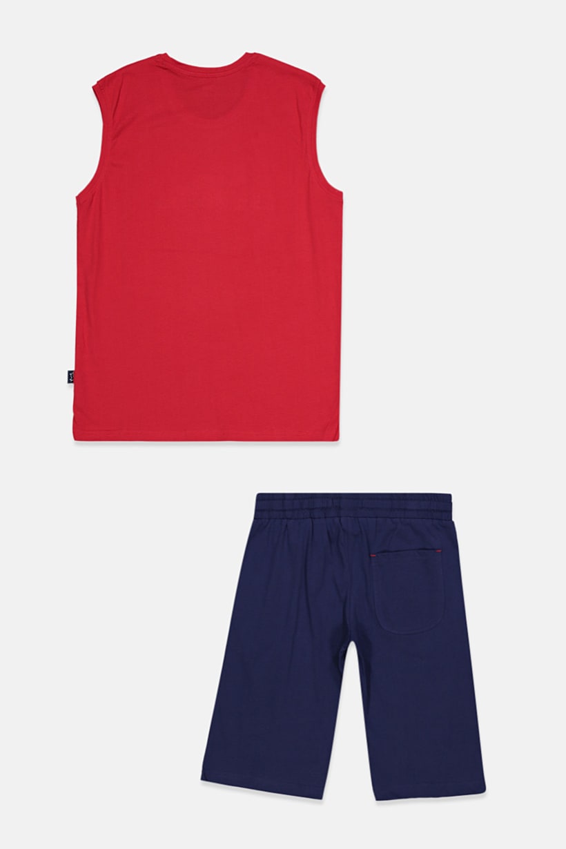 This product is suitable for boys and made of 100% cotton fabric. It features an embroidered pattern and print, with a pullover closure and a straight hem. The sleeveless design has a crew neckline and is available in red and navy blue colors. It is machine washable and perfect for casual occasions.