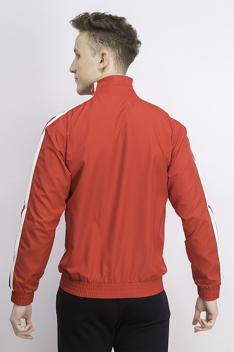 This product is easy to care for as it is machine washable. It has a sportswear fit and is available in US sizes. The jacket is lightweight and suitable for training. It is made of 100% polyester fabric and features a stripe pattern and brand logo. The jacket has a zipper closure and comes in a red color family. It is classified as a sportswear jacket.