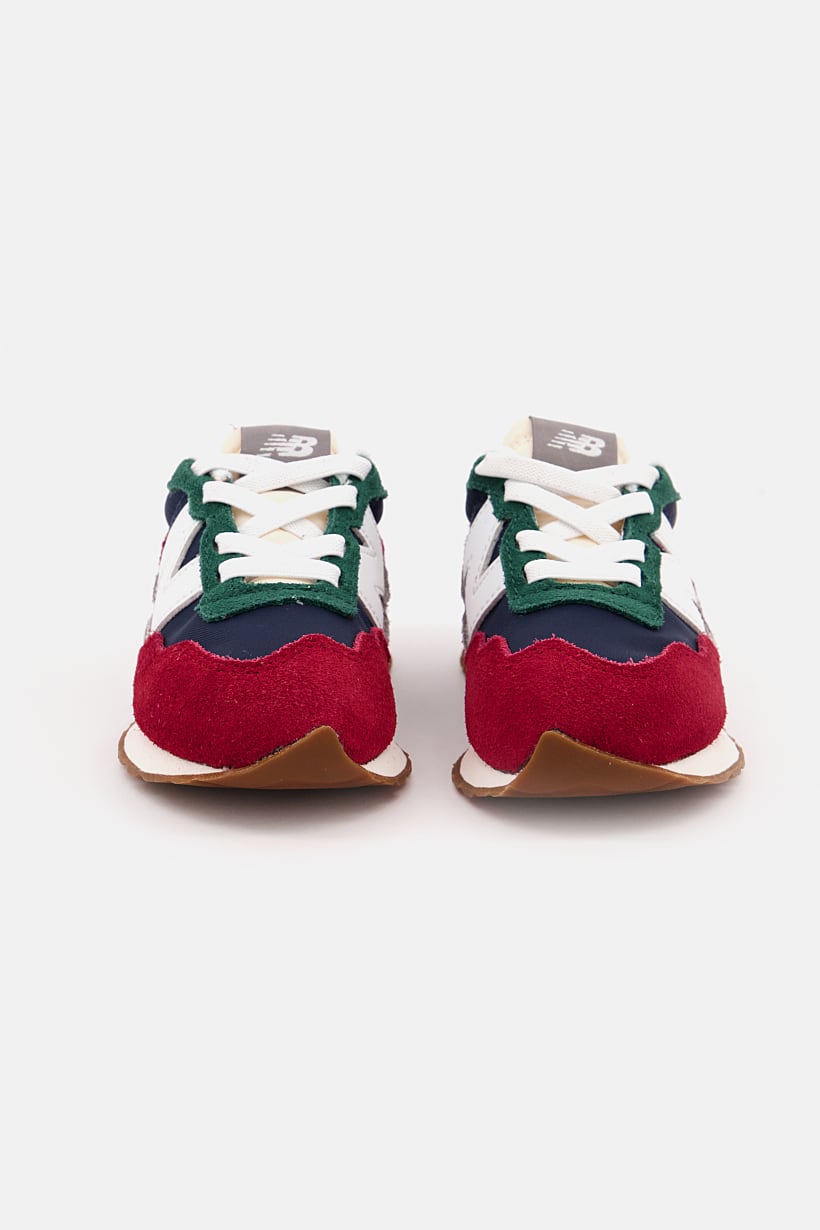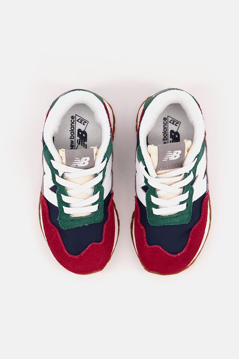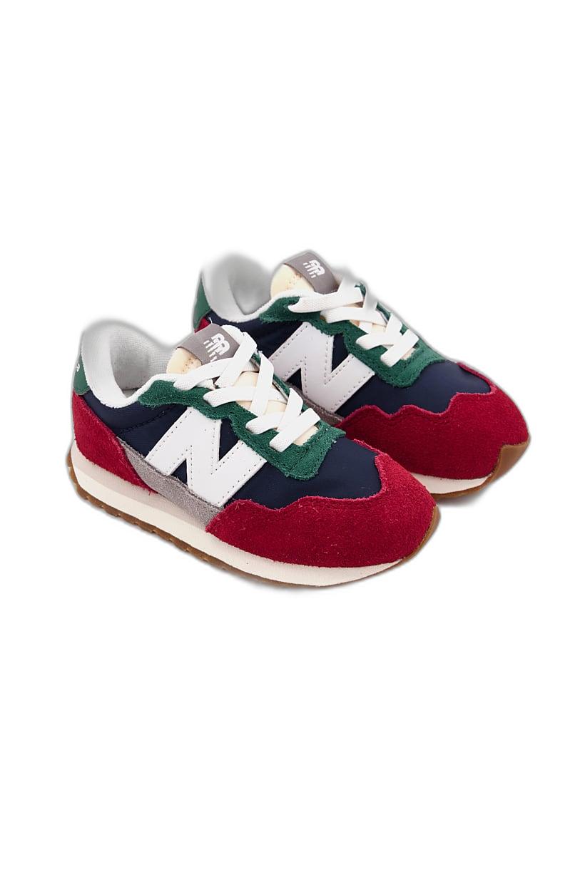 This product is suitable for boys and features a lace-up closure and a closed-toe design with a latex sole. It does not have any specific character design. Please note that the product color may vary slightly due to lighting or monitor settings. It is made of synthetic leather and comes in a colorblock pattern with shades of green, red, and navy blue. This shoe is perfect for casual occasions.