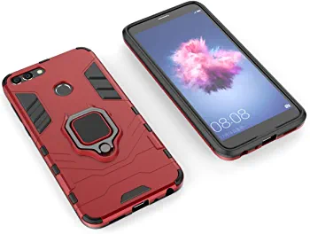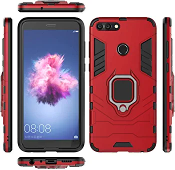 Red Dual Layer Rugged Cover with Metal Ring Grip and Kickstand for Huawei P Smart and Enjoy 7S. Shockproof and works with Magnetic Car Mount.