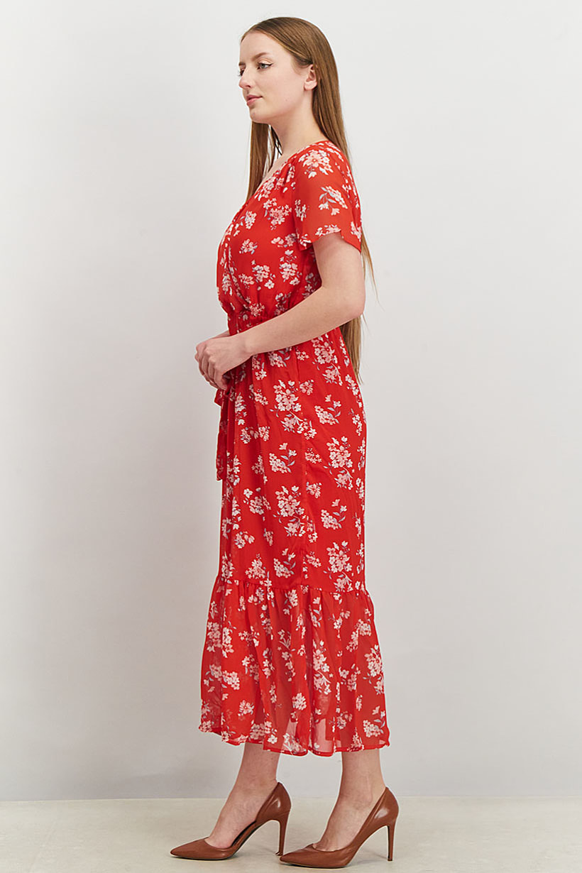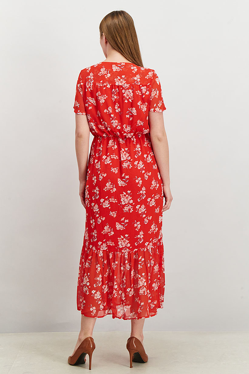 Care : Machine washable, Dress Style : Maxi, Fit : Regular fit, Ideal For : Women, Size shown : International, Types of Hem : Straight hem, Types of Neckline & Collar : V-neckline, Types of Sleeve : Short sleeve, Fabrics : 100% Polyester, Occasion : Casual, Pattern & Print : Floral Print, Types of Closures : Pullover, Color Family : Red,