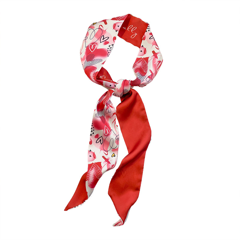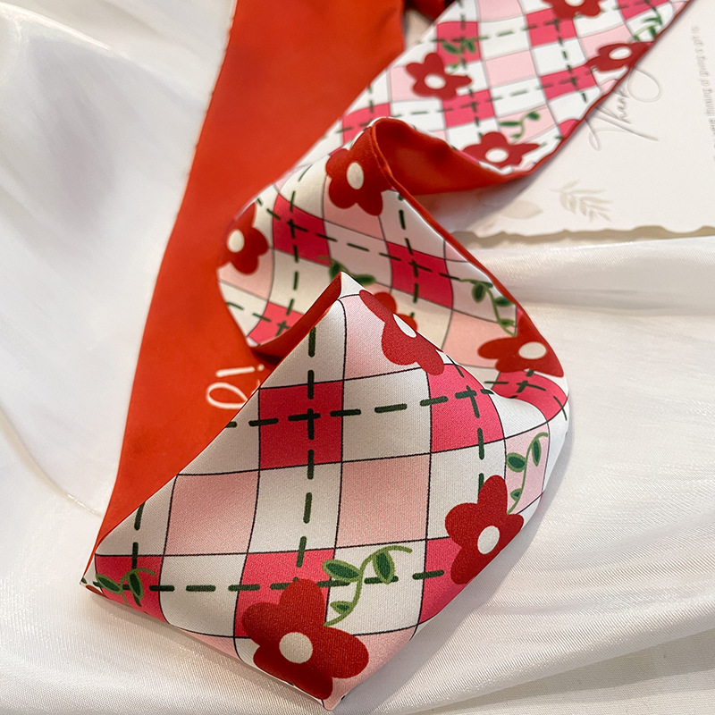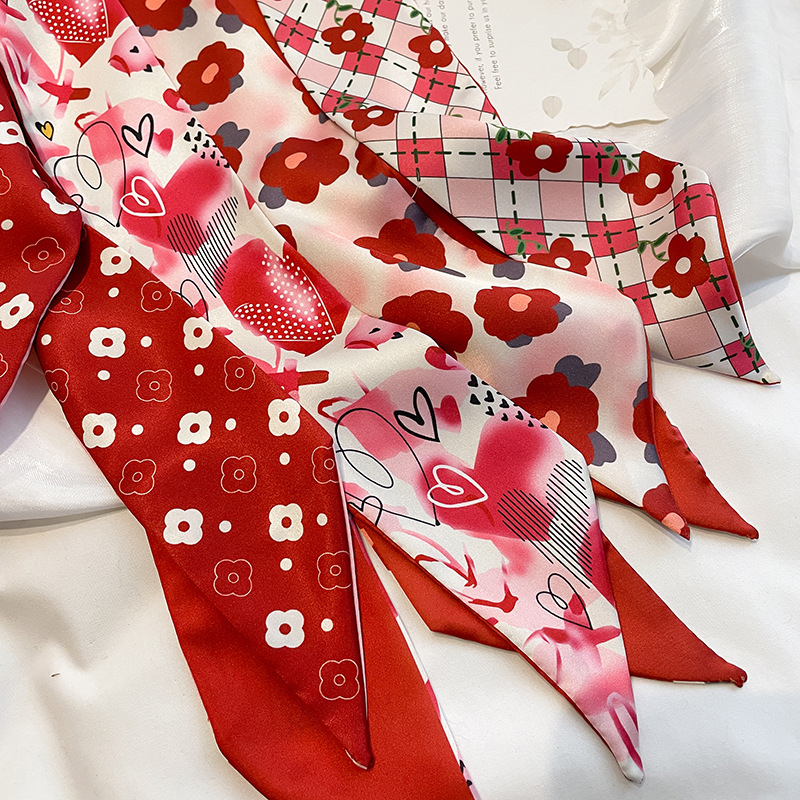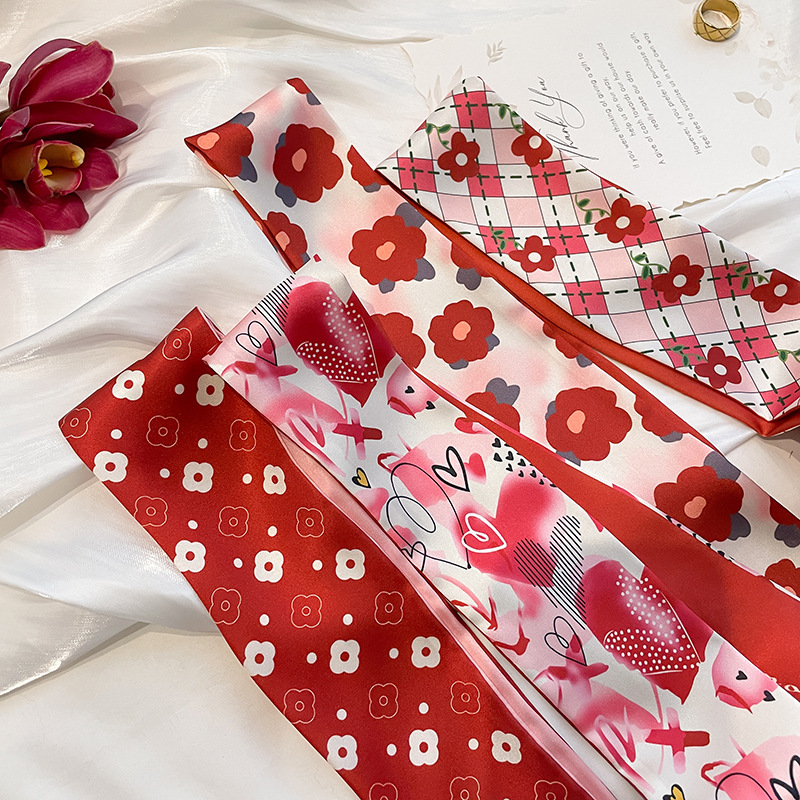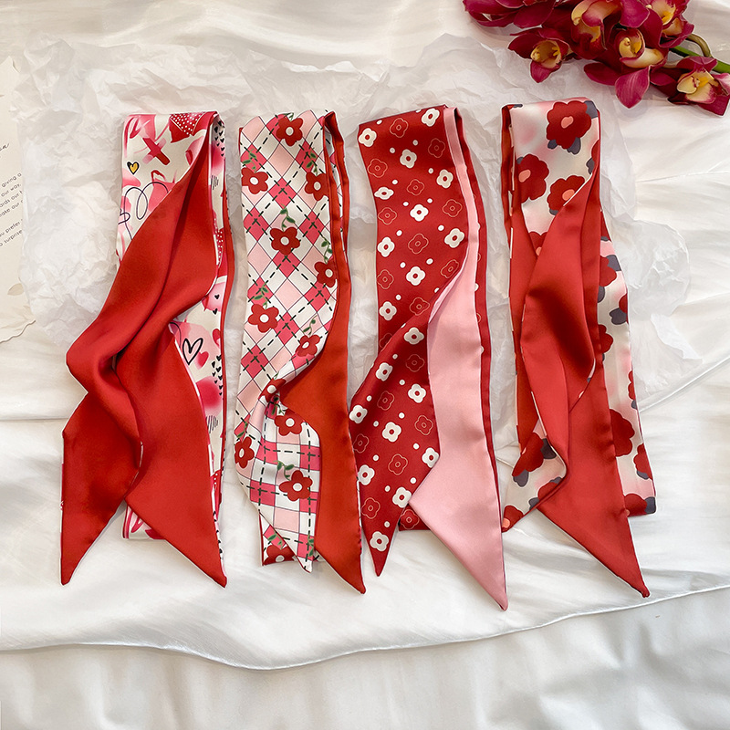Red French Style Tie Hair Spring and Summer Thin Elegant Flower Silk Scarf Women's Ribbon Decoration Small Scarf Ribbon Small Long Strip