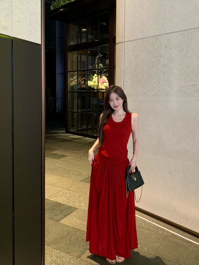 | nameOriginal | Red knitted casual long skirt two-piece suspender set |