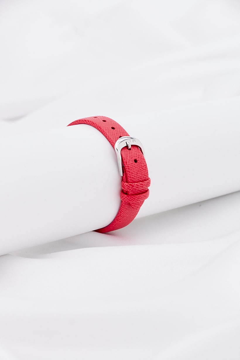 This product features a round dial shape with a glass window and marker display. It is an ideal gift for women and has a red leather strap with a buckle closure. The watch is analog and has a silver dial color. Please note that the product color may vary slightly due to lighting or monitor settings. The color family is red.