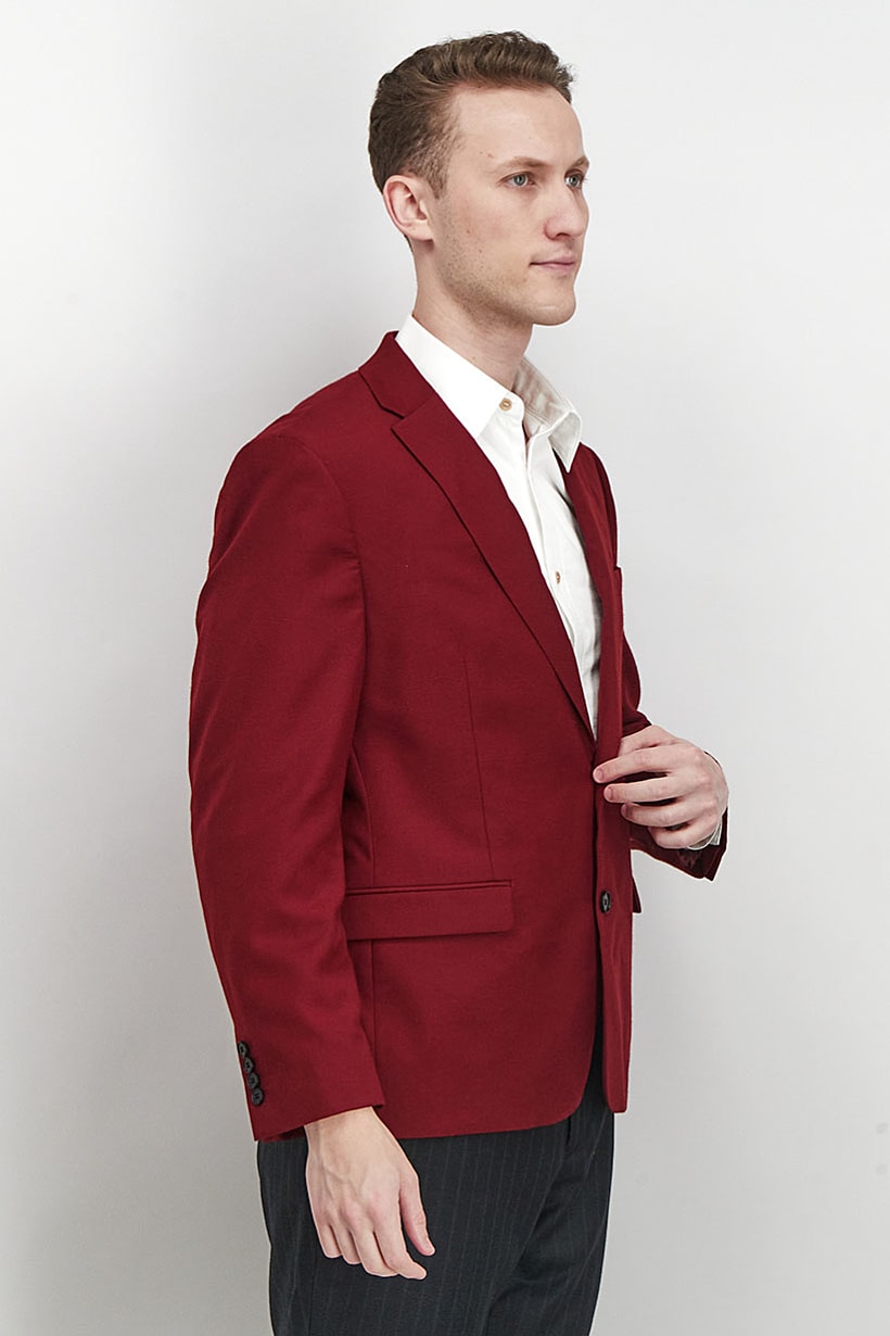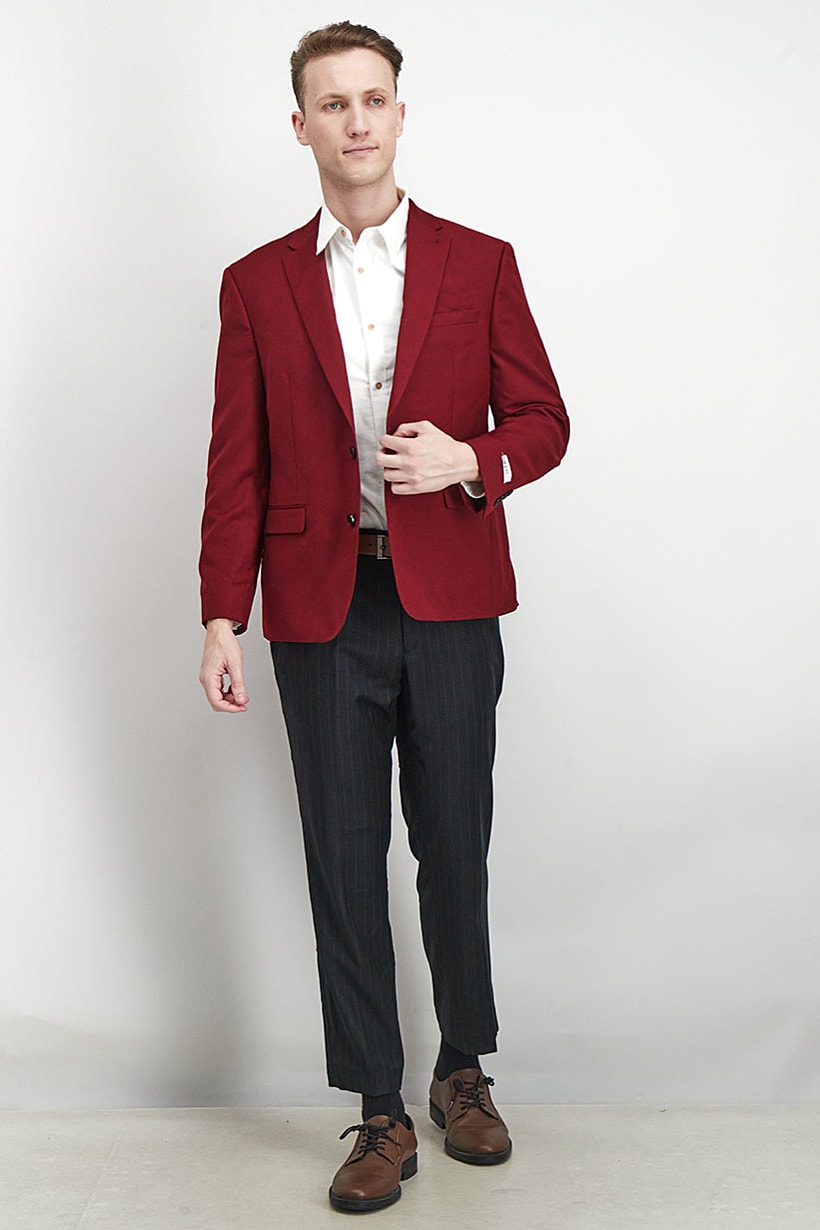 Care : Machine washable, Fit : Slim fit, Size shown : US, Suit Type : Suit Jackets, Type of Neckline & Collar : Notched collar , Fabrics : 100% Polyester, Pattern & Print : Plain/Solid, Color Family : Red, Occasion : Formal,