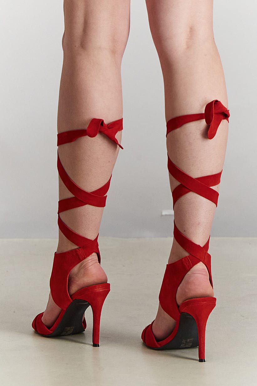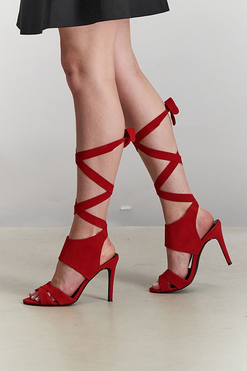 Heel Height : 4" / 10 cm, Heel Style : Stiletto heel, Ideal For : Women, Shoe Closure : Lace up closure, Sole Material : Synthetic sole, Toe Style : Open toe, Occasion : Casual, Shoe Material : Suede , Color Family : Red,