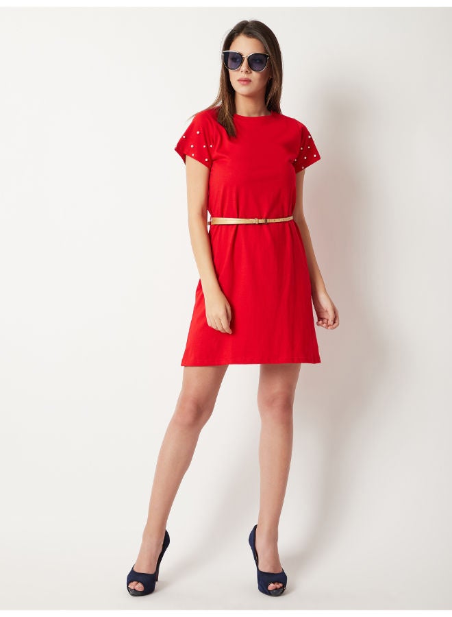 The Street Wheel Pearl Sleeve T-Shirt Dress in Red is the perfect combination of comfort and style. Made from soft and breathable fabric, this dress features a classic t-shirt design with a relaxed fit that flatters all body types. The standout feature of this dress is the pearl detailing on the sleeves, adding a touch of elegance and sophistication to the overall look. The vibrant red color is perfect for making a statement and standing out in a crowd. This dress is versatile and can be dressed up or down, making it a great addition to any wardrobe. Perfect for a day out with friends or a casual date night, this dress is sure to turn heads and make you feel confident and stylish.