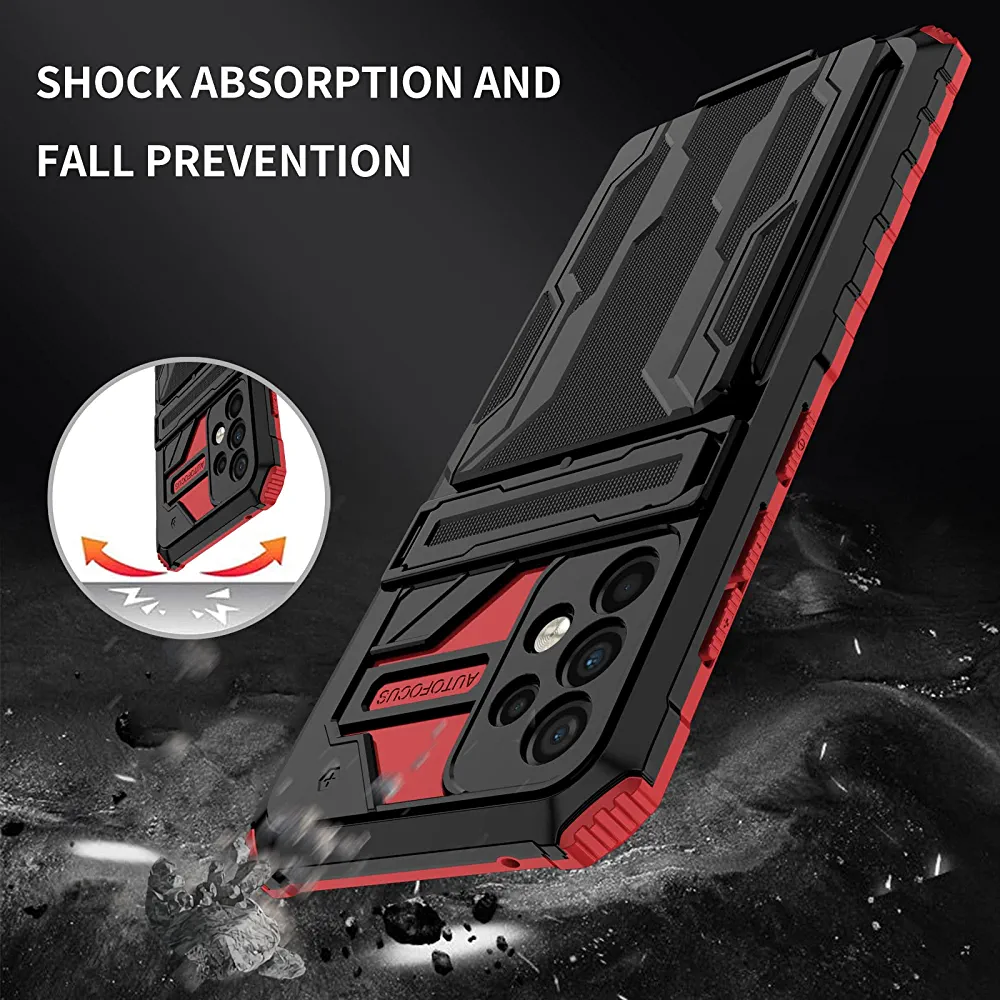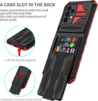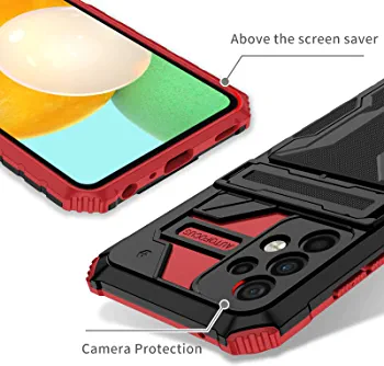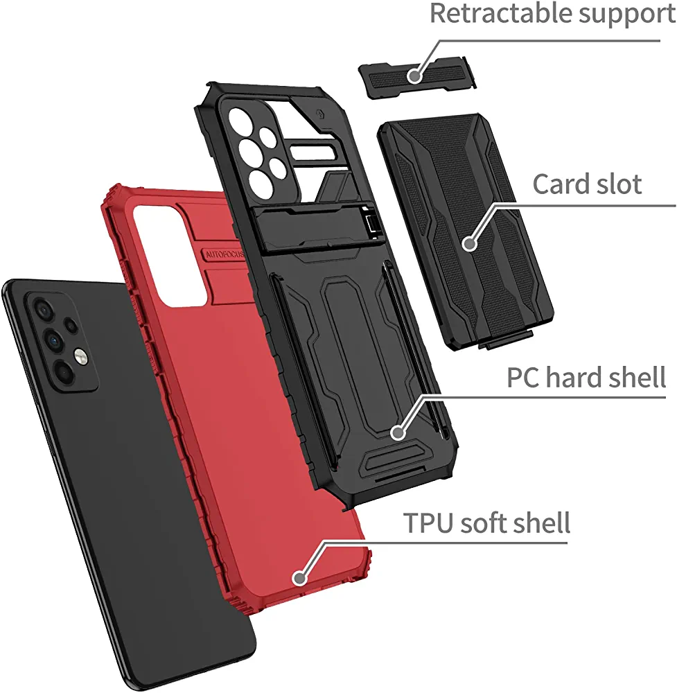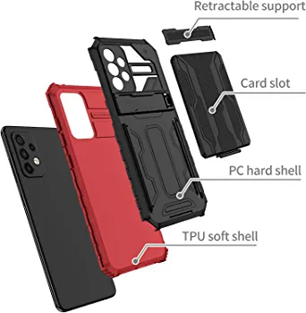 Red phone case for Samsung Galaxy A52/A52S 5G with tempered glass screen protector, slim credit card holder stand, and cell accessories. Suitable for both men and women.