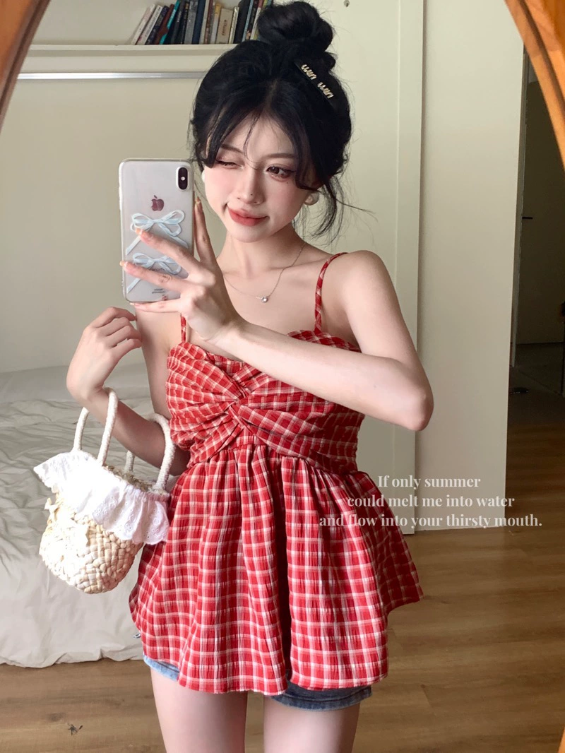 | nameOriginal | Red plaid backless loose design sleeveless suspender belt |
