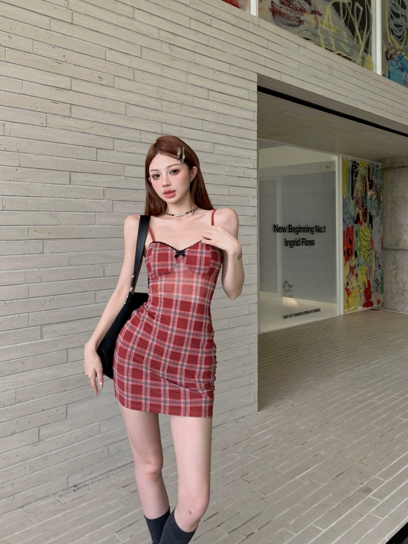 | nameOriginal | Red plaid slim summer hip-hugging suspender dress |
