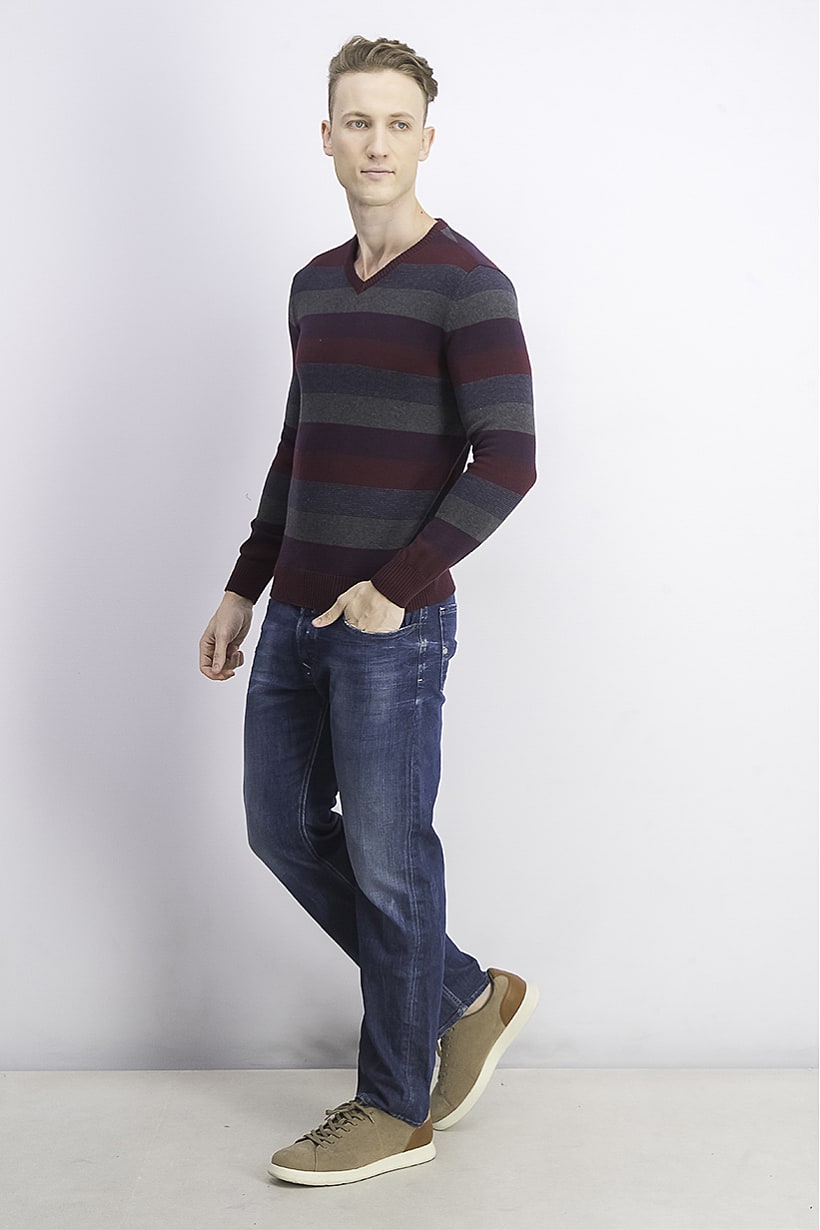 | nameOriginal | Men Stripe V-neck Sweater, Red Plum |