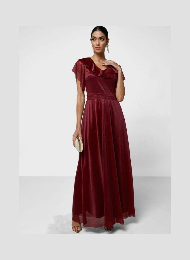 Make a statement at your upcoming special occasion with this stunning dress adorned with shimmering embellishments. Crafted from a mid-weight, textured polyester fabric, it features a flattering V-neckline with a delicate ruffled overlay. The concealed zipper placket ensures a secure fit, while the maxi length and flared hem style add a touch of elegance to your look.