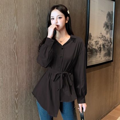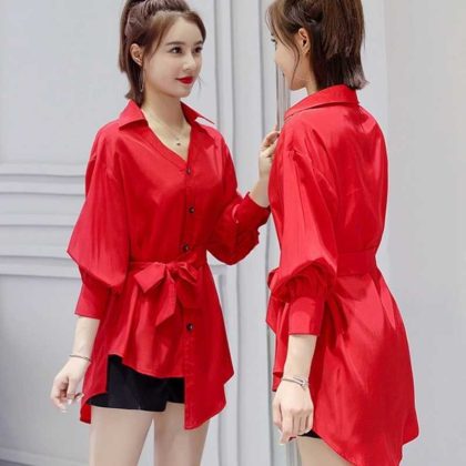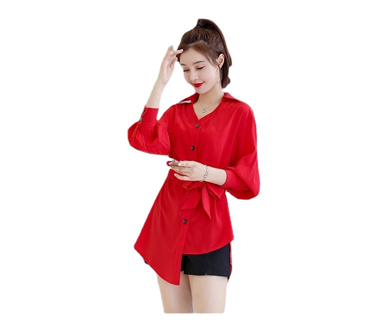 Red Shirt Women’s 2022 Spring and Autumn Irregular Mid-length White Chiffon Shirt Belly Hiding Hyun-a Tunic Top