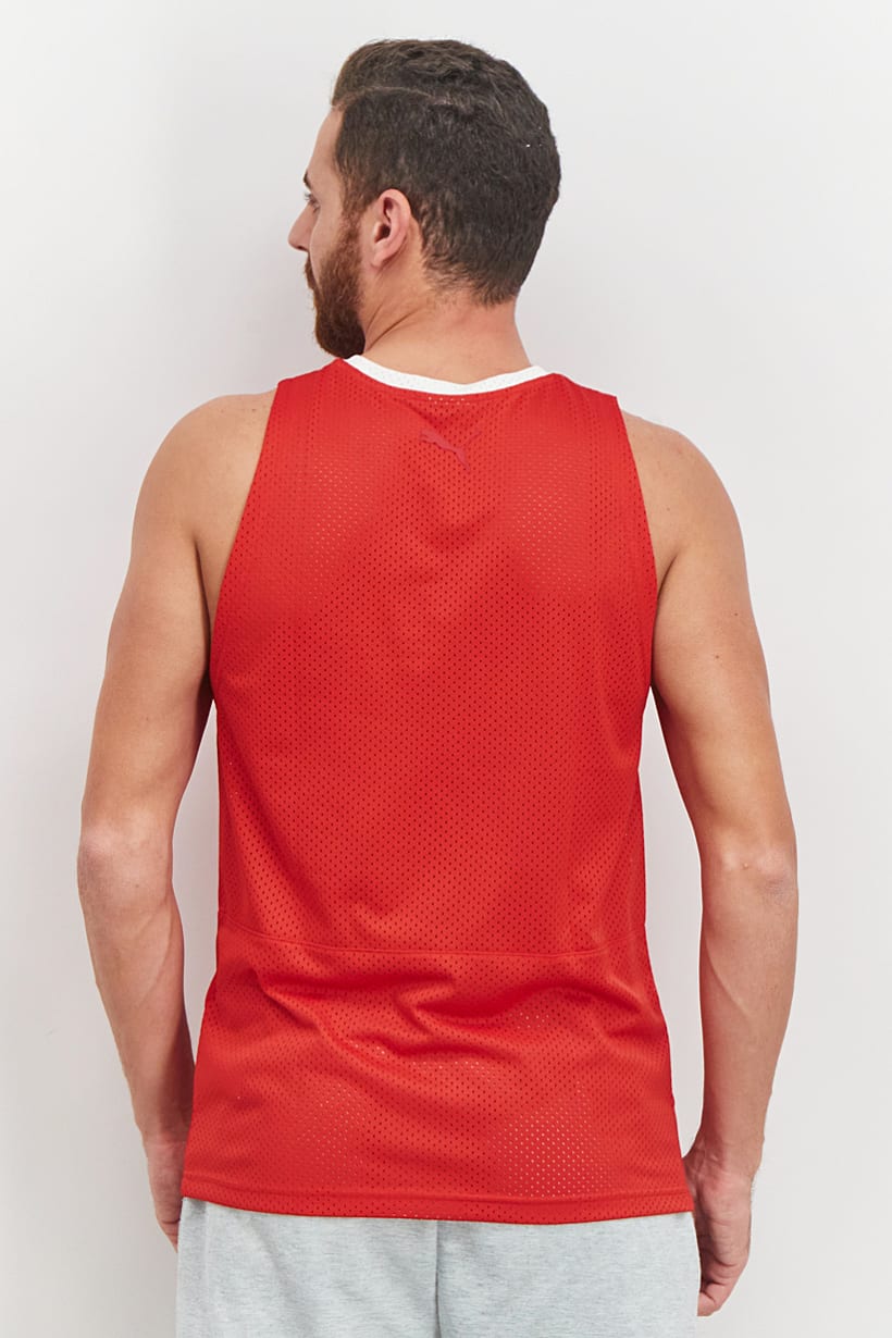 This sleeveless training t-shirt is made of 100% polyester with a textured pattern and embroidered details. It features a round neckline and collar, and comes in a regular fit with a light thickness. The t-shirt is machine washable and comes in a vibrant red color, with the size shown in US measurements. Perfect for any sports activity.