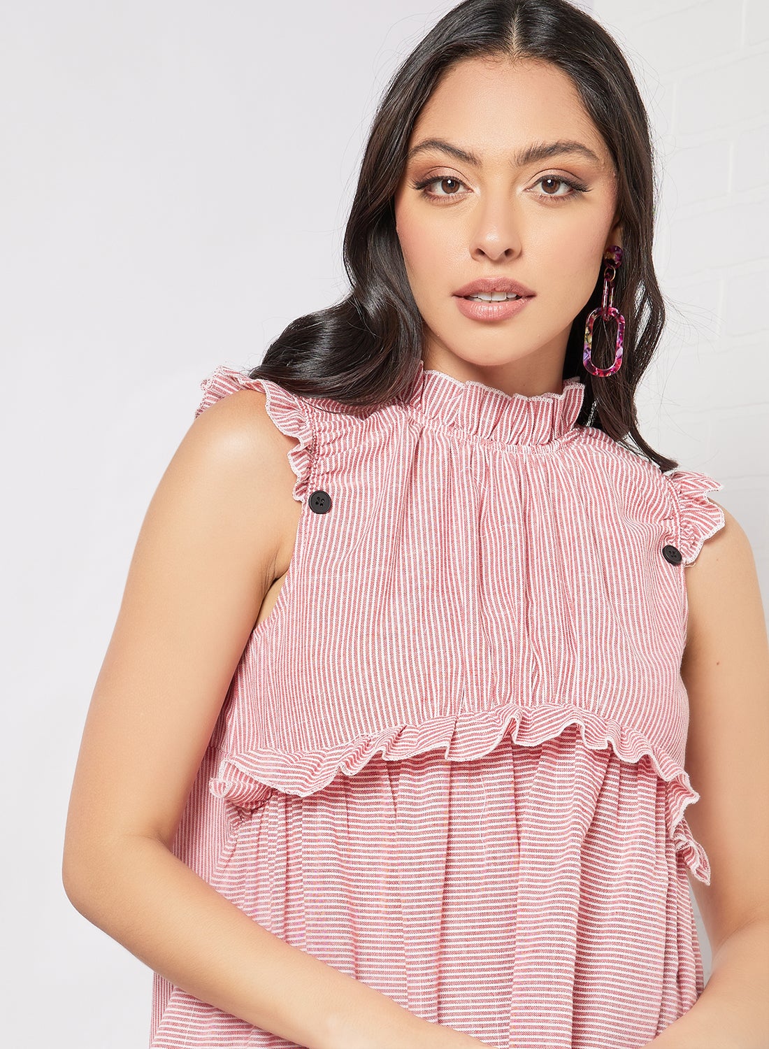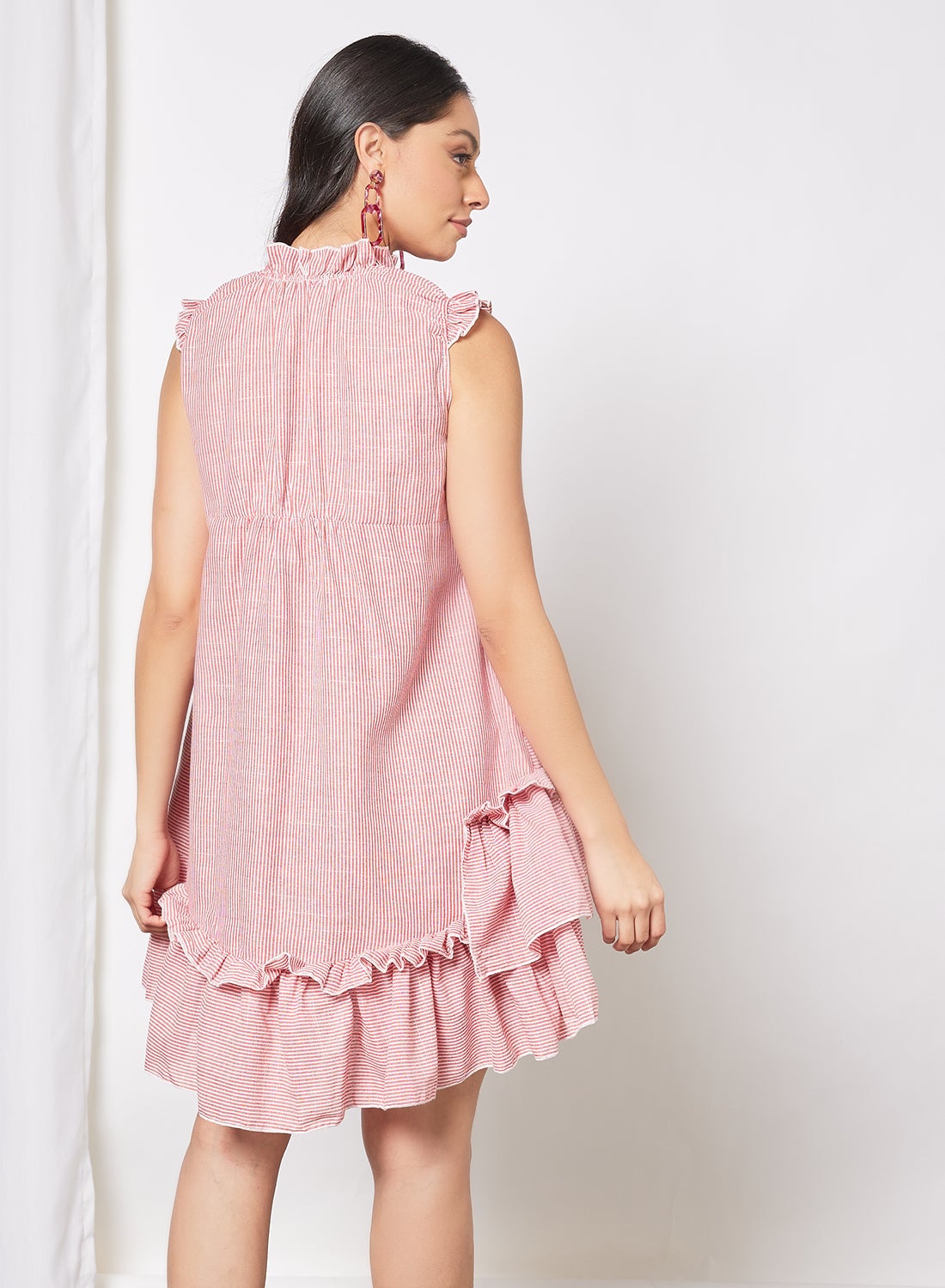 | nameOriginal | Women's Polyester Sleeveless Knee Length Layered Dress With Ruffle High Neck Stripes Pattern Red |