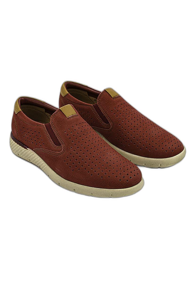 This product is suitable for men and comes with a leather insole for added comfort. It is a slip-on shoe with a standard width and a closed toe design. The rubber sole provides durability and traction. Please note that the product color may vary slightly due to lighting or monitor settings. The shoe is made of synthetic leather and is available in a red color family.