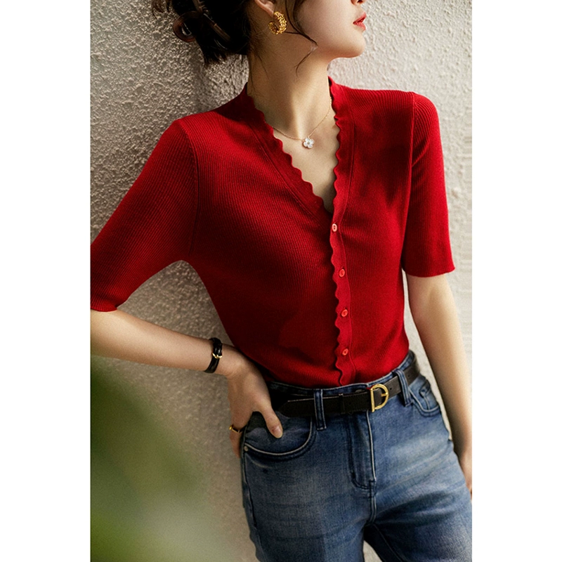 | nameOriginal | Red V-neck Wool Ice Silk T-shirt Women's Summer Short Sleeve |