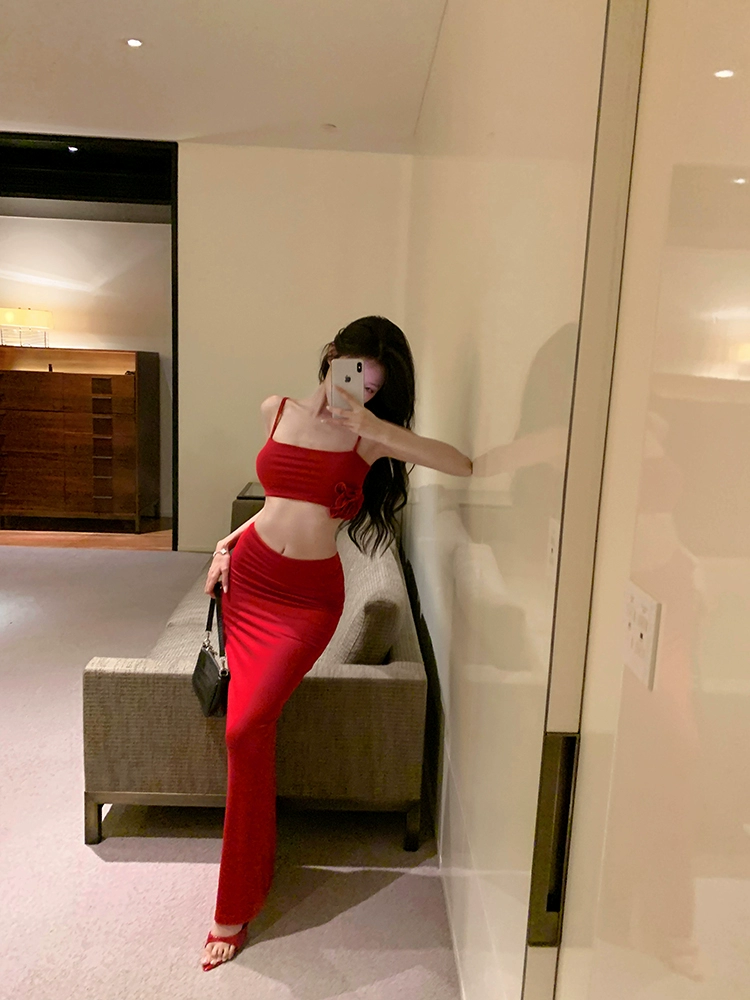| nameOriginal | Red women's summer hip bust two-piece set with flowers |