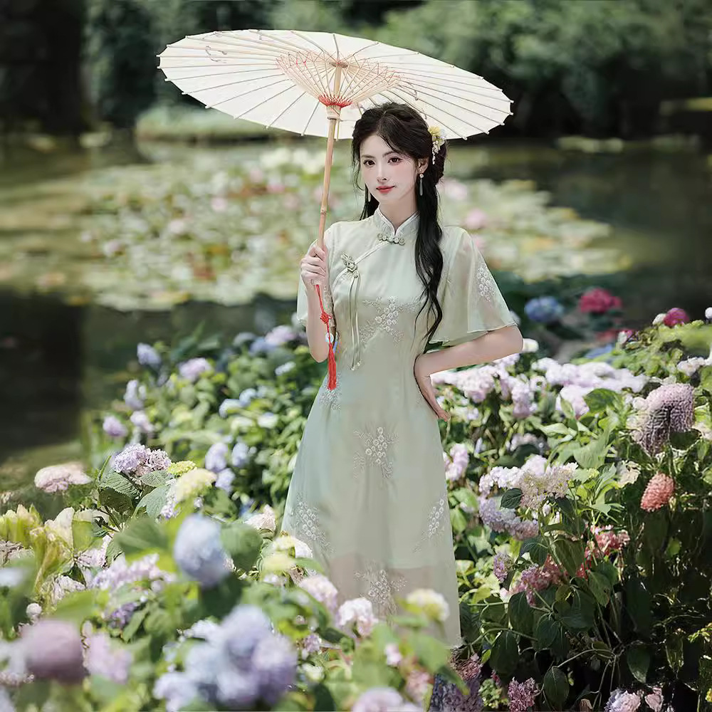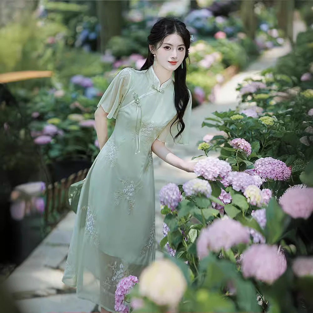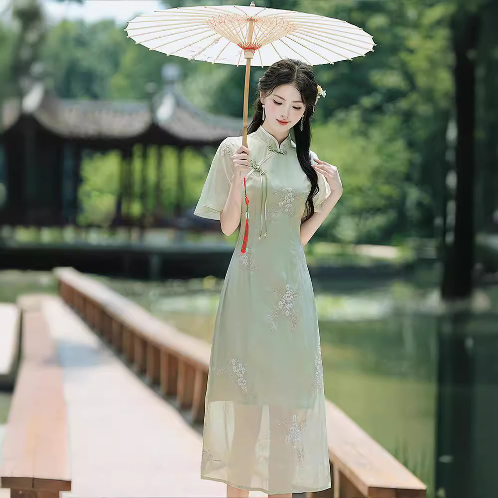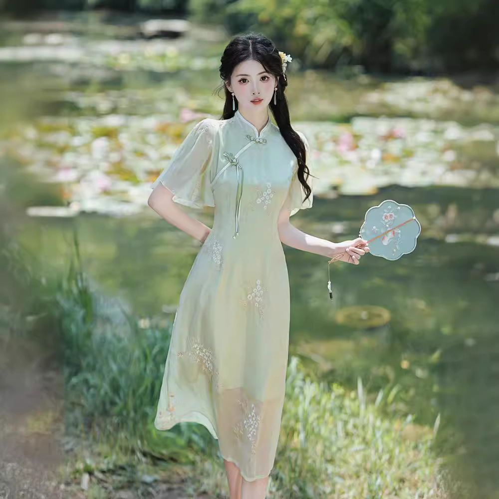 Republic of China Style Improved Cheongsam dress Women’s 2024 Girls’ Artistic Retro Hanfu Slant Flap Button Vertical Collar Short Sleeve