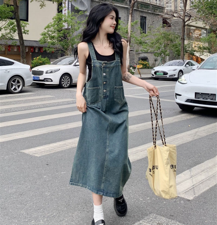 | nameOriginal | Retro age-reducing denim suspender skirt women's summer design niche single-breasted slim mid-length suspender dress |