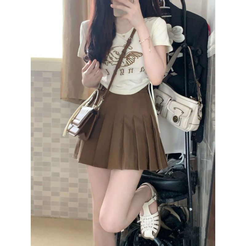 | nameOriginal | Retro American Style Hot Girl Style Women's Summer Letter Strap Drawstring Short-sleeved Shirt Pleated Skirt Small Two-piece Set |