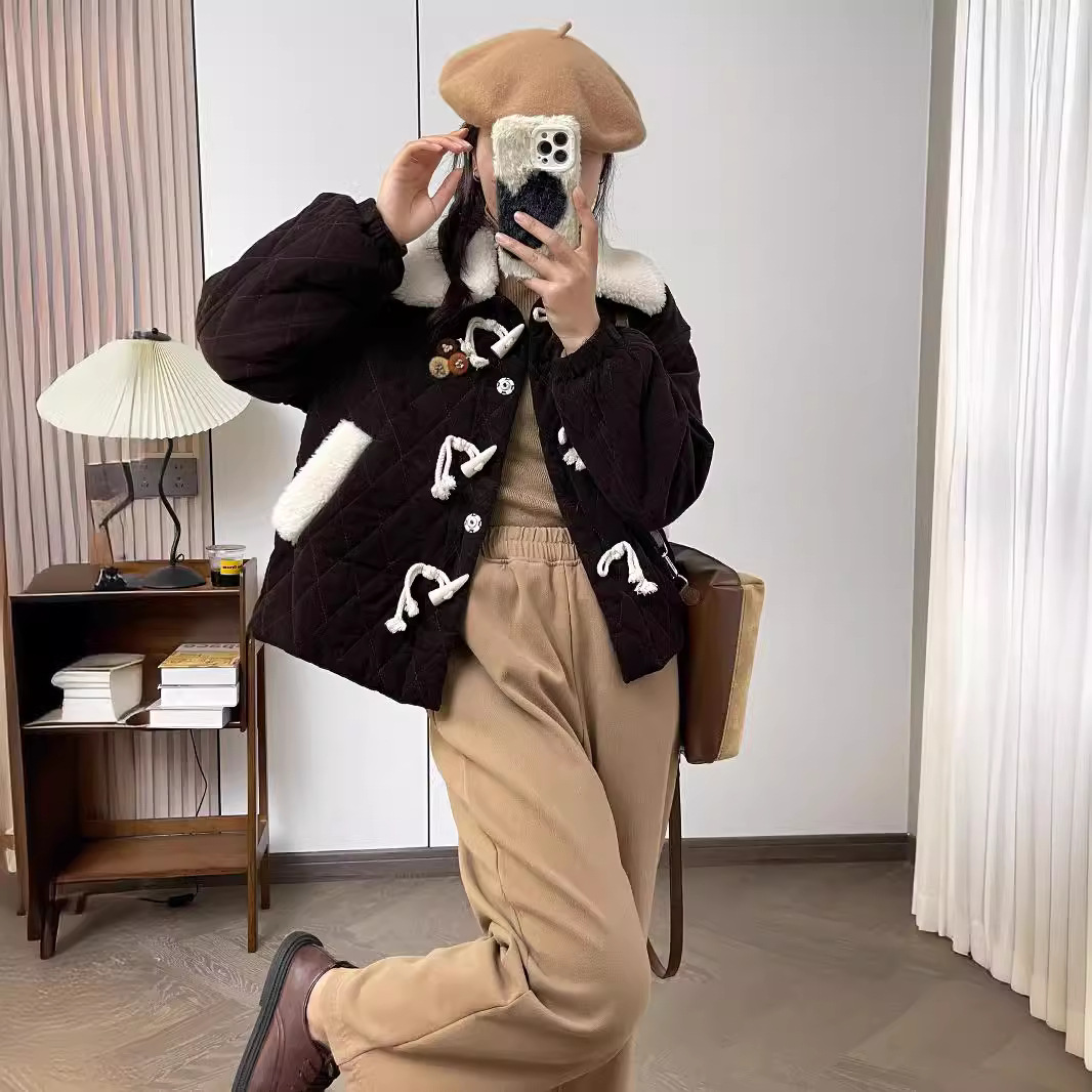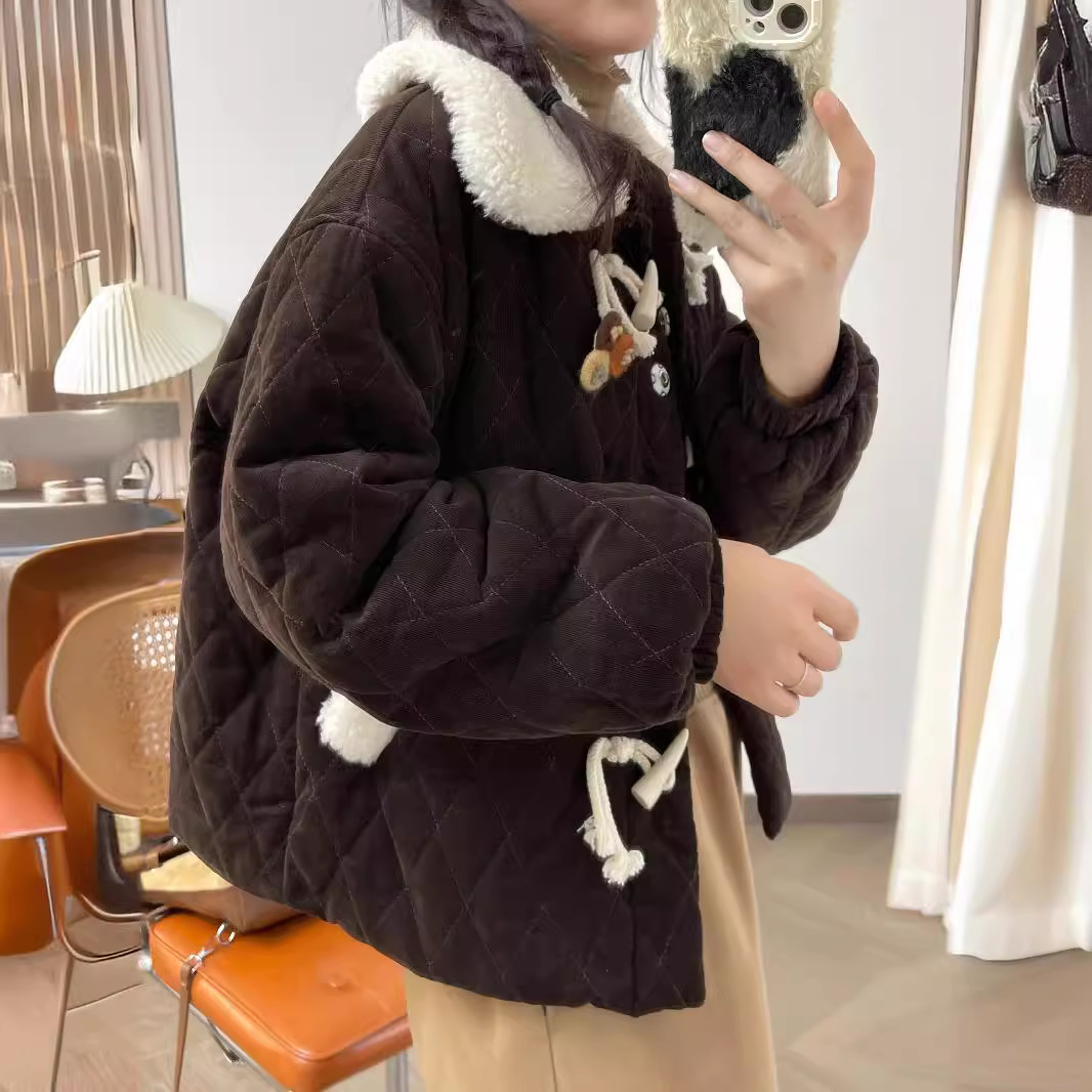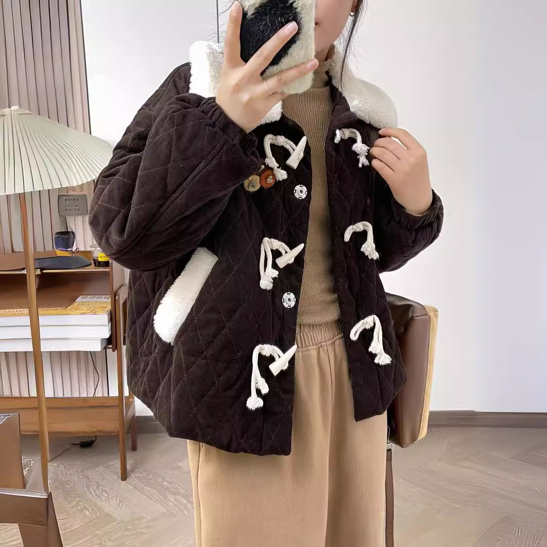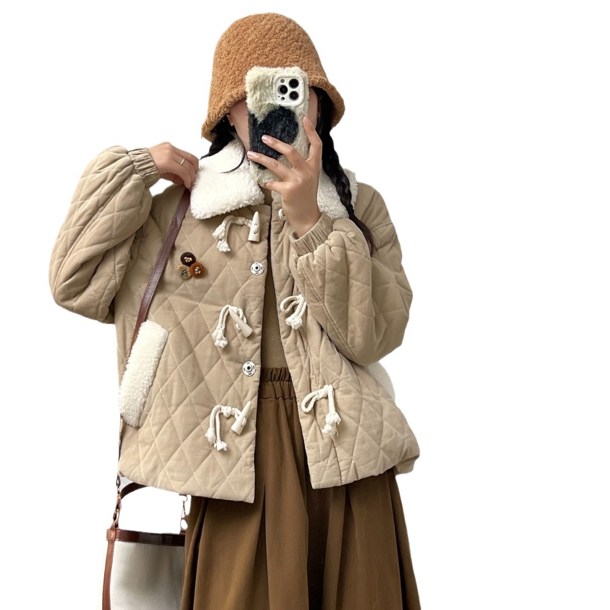 | nameOriginal | Retro artistic lamb wool doll collar cotton-padded coat warm cotton-padded coat autumn and winter New horn buckle corduroy short coat for women |