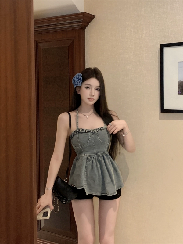 | nameOriginal | Retro blue denim slim fit sleeveless halter neck strap |