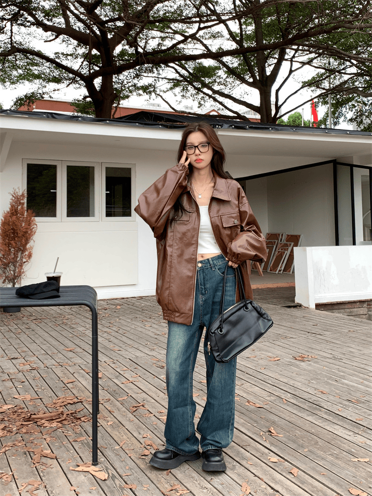 | nameOriginal | Retro brown baseball uniform spring and autumn loose jacket leather jacket |