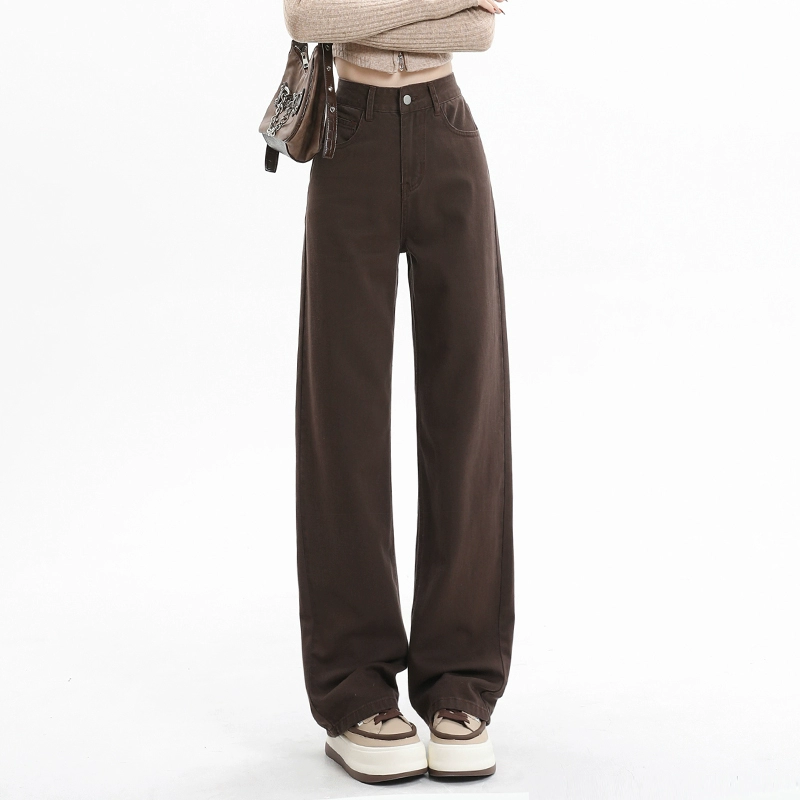 Retro coffee color high -waist straight tube vertical versatile jeans