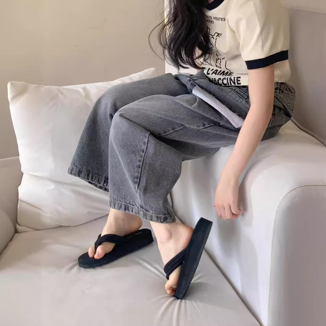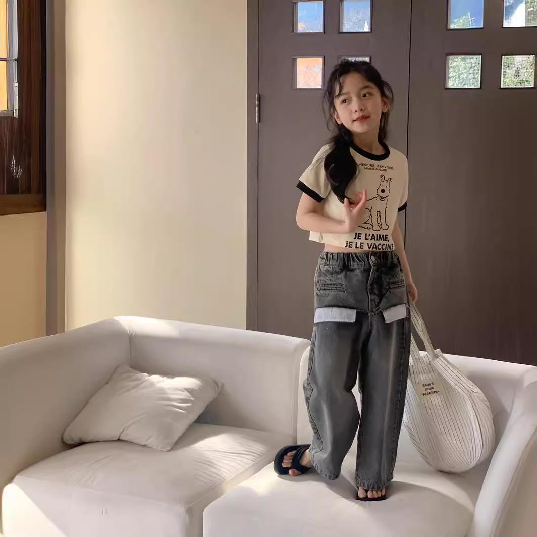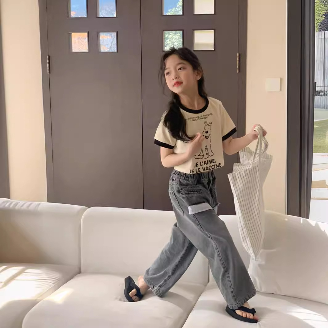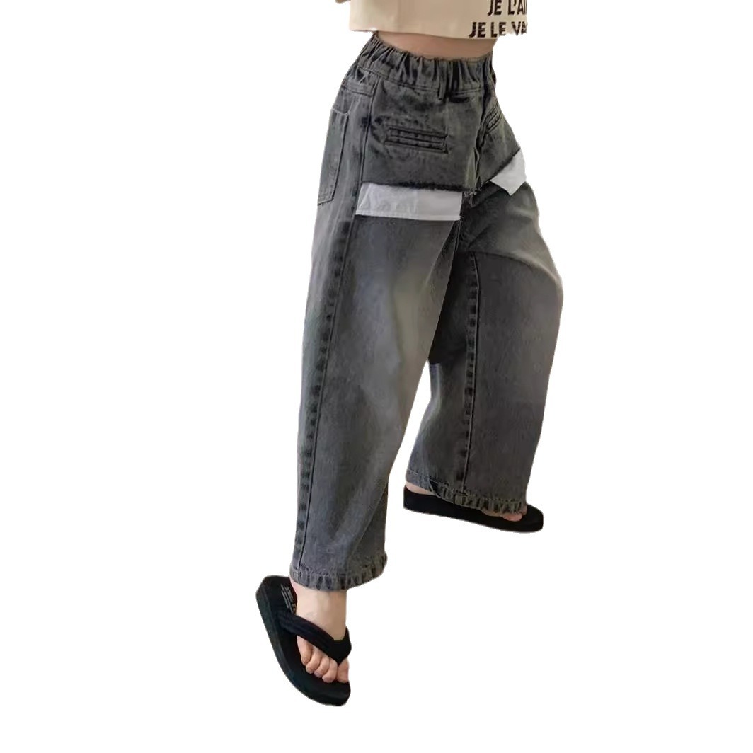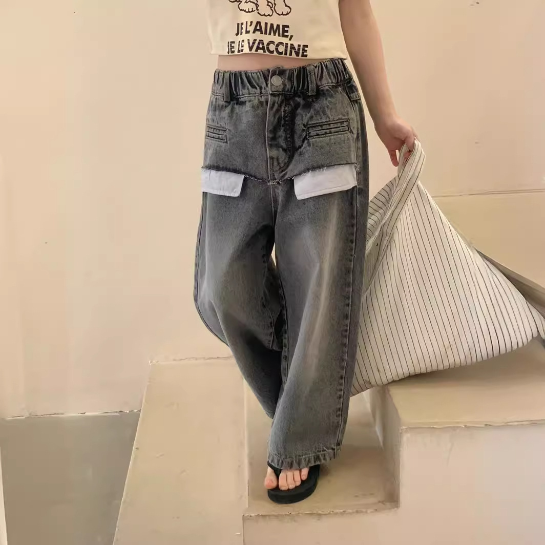 Retro cement gray Denim trousers medium and large boys and girls 2024 spring and summer irregular pocket pants design pants