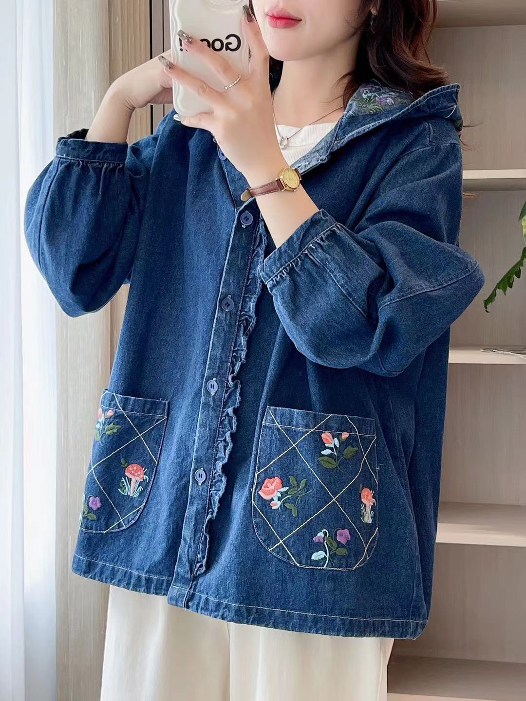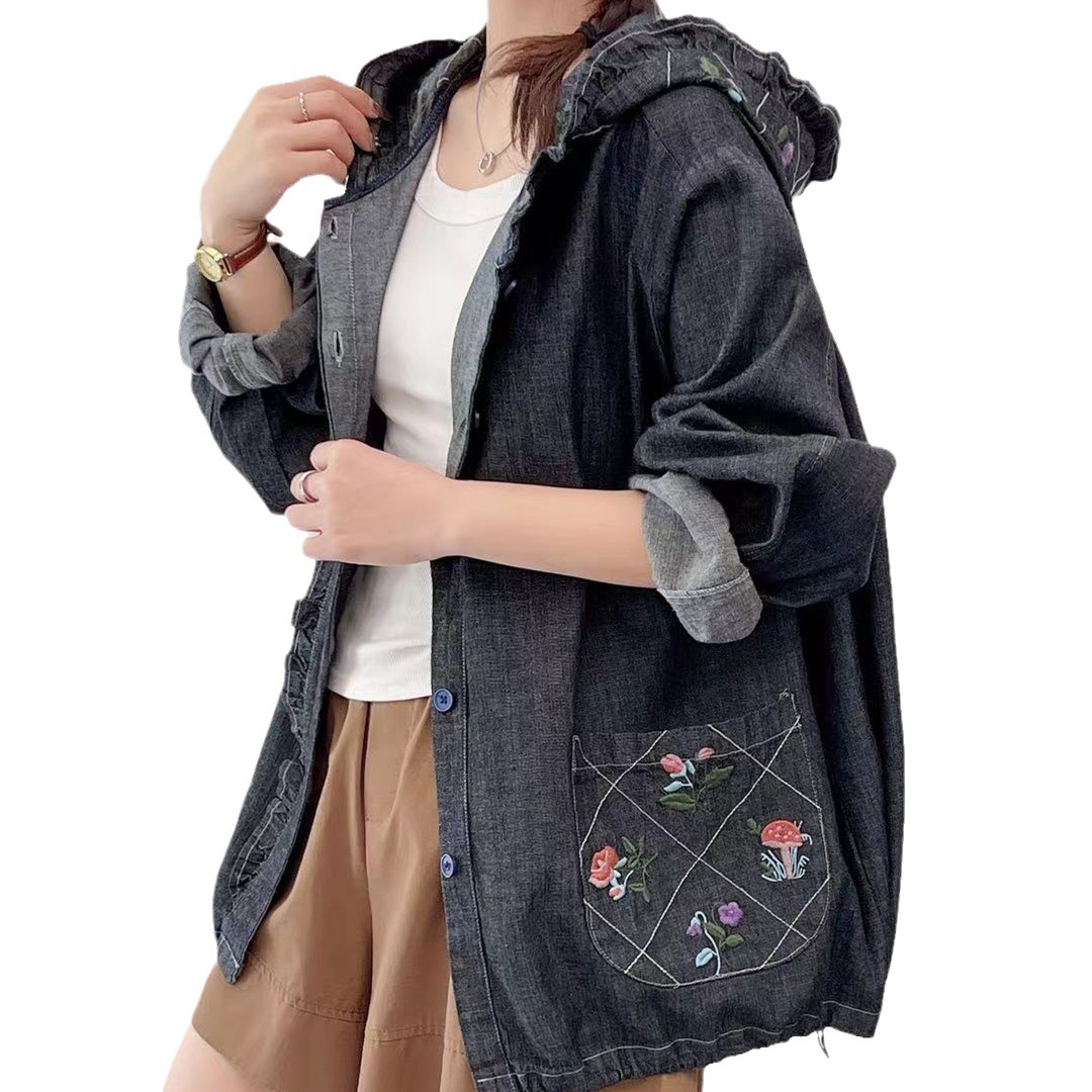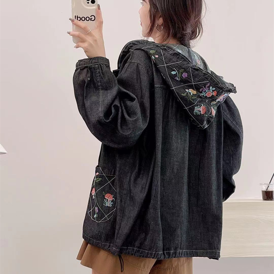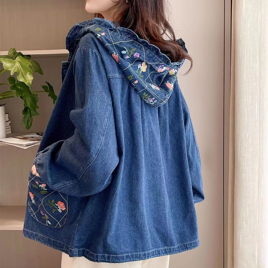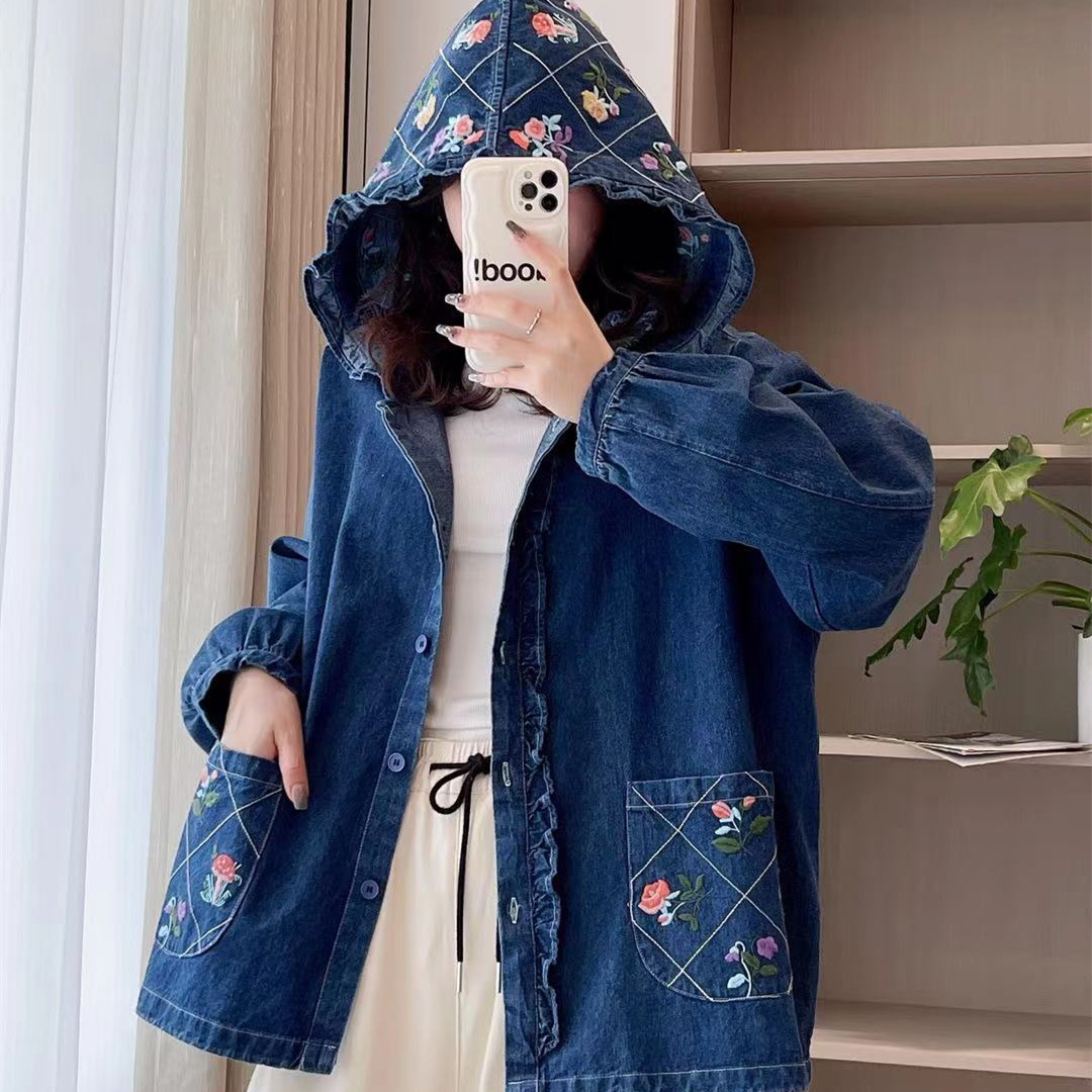 | nameOriginal | Retro chic embroidered small flower New Mori women's hooded Denim coat loose all-match age-reducing cardigan |