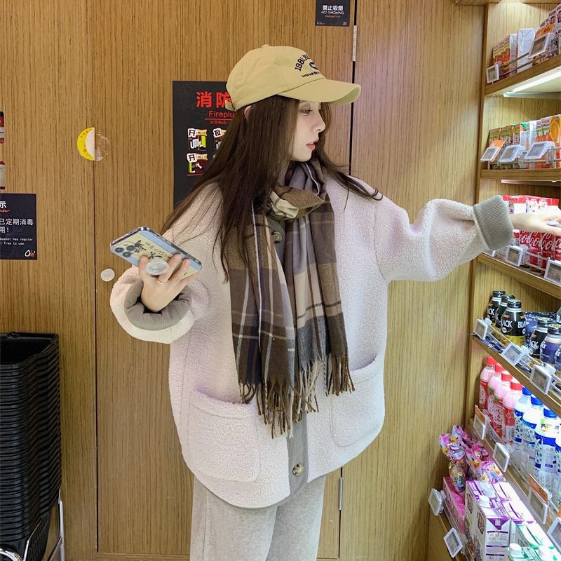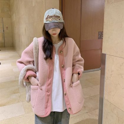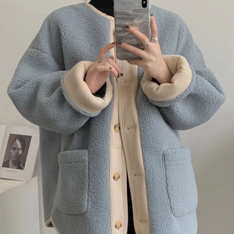 | nameOriginal | Retro contrast color fleece-lined thick lambswool cardigan for women 2023 Winter Chanel style casual loose lambswool coat |