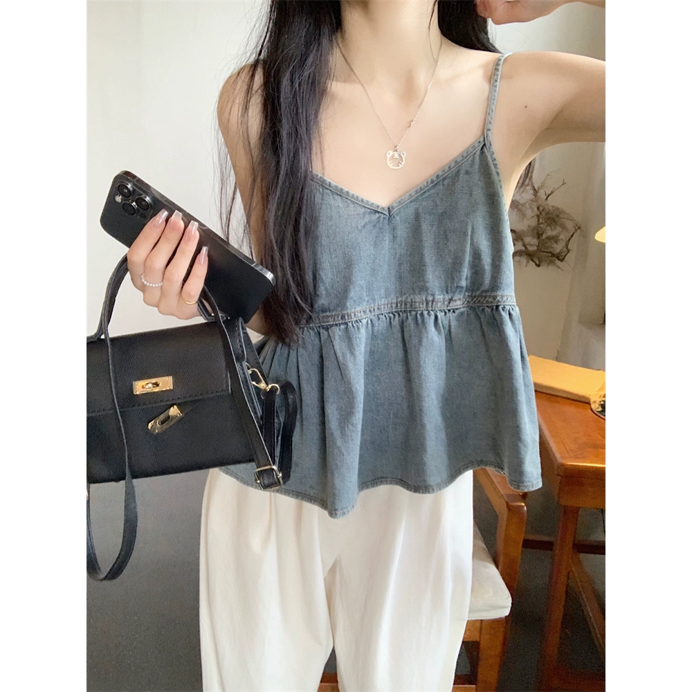 | nameOriginal | Retro denim ruffled sleeveless top camisole |