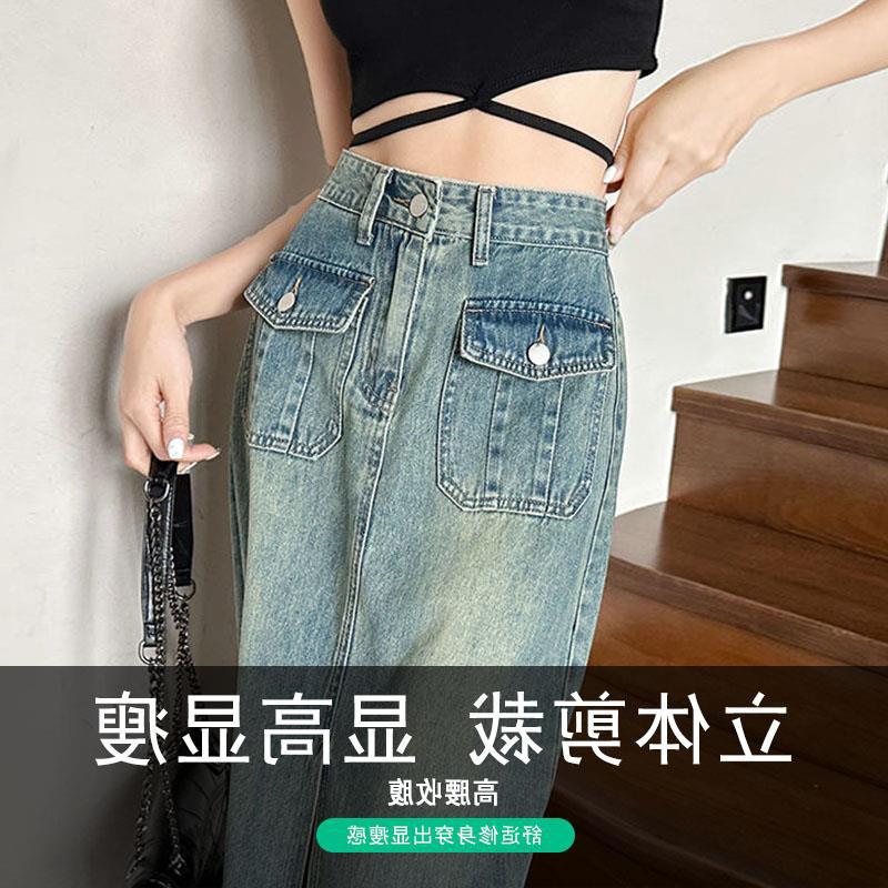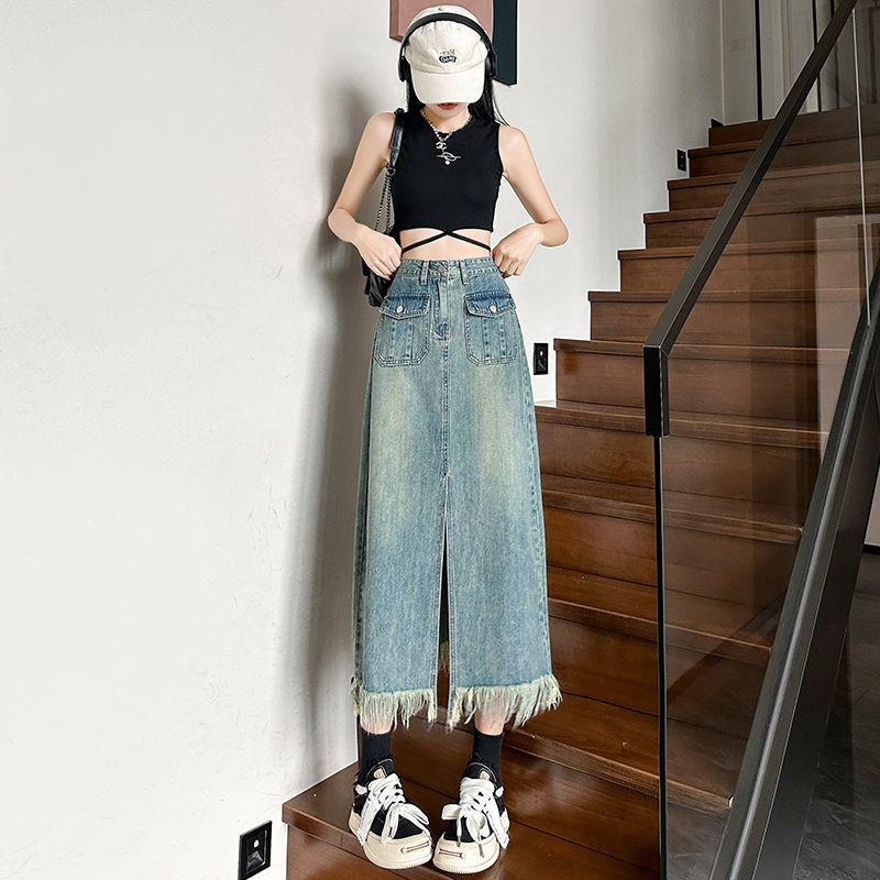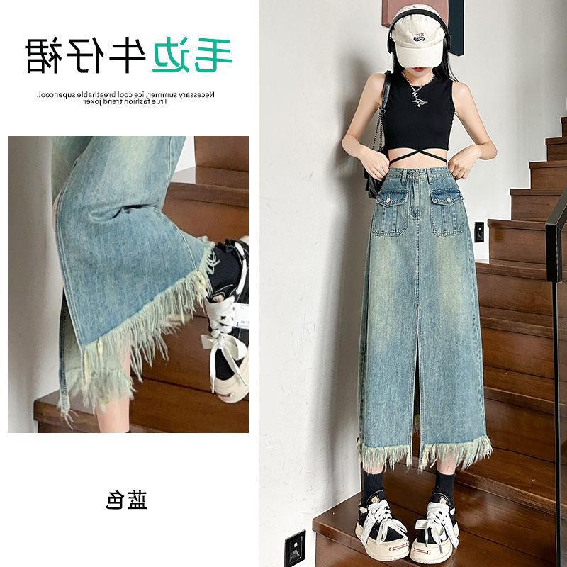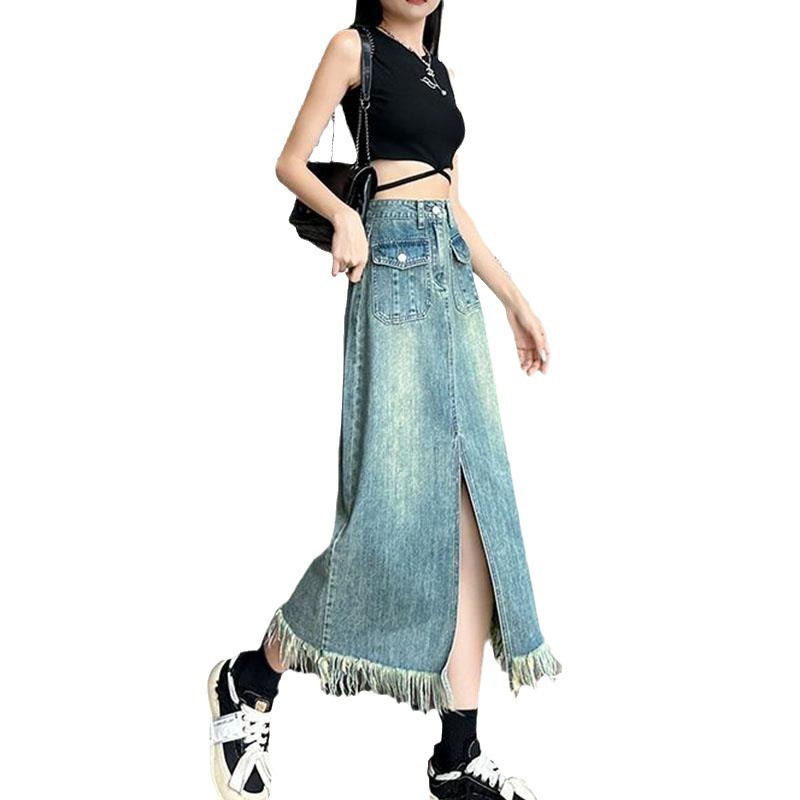 Retro Denim Skirt Women’s Autumn and Winter High Waist Denim Skirt Slimming Hip Covering A- line Tassel Denim Long Skirt