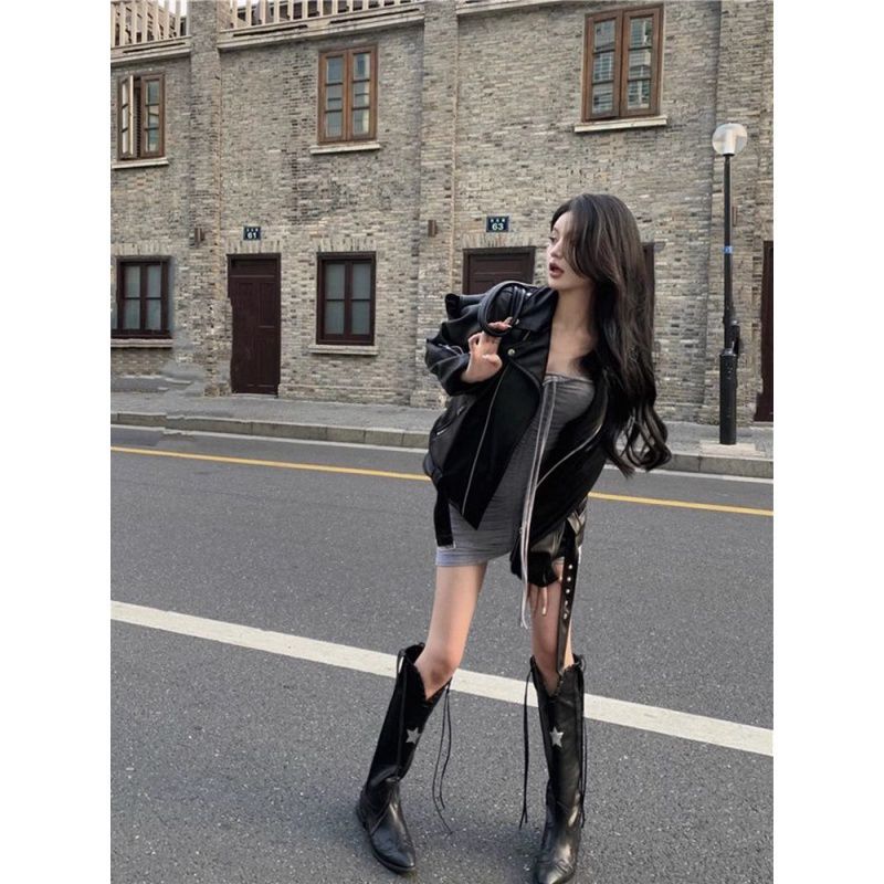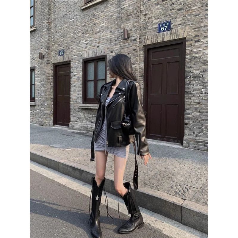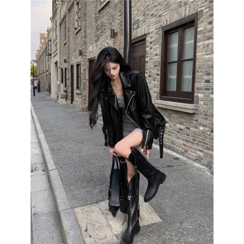 | nameOriginal | Retro Design Sense Black PU Leather Jacket Women's 2024 Spring and Autumn New American Style Street Ins Motorcycle Jacket |