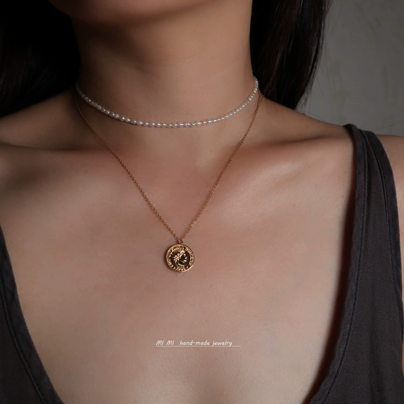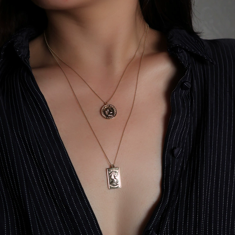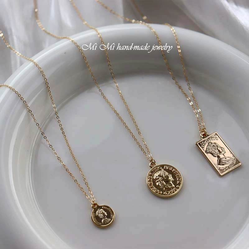 | nameOriginal | Retro European and American imported 14K gold medal coin necklace, non-fading ball chain, gold coin queen clavicle chain |
