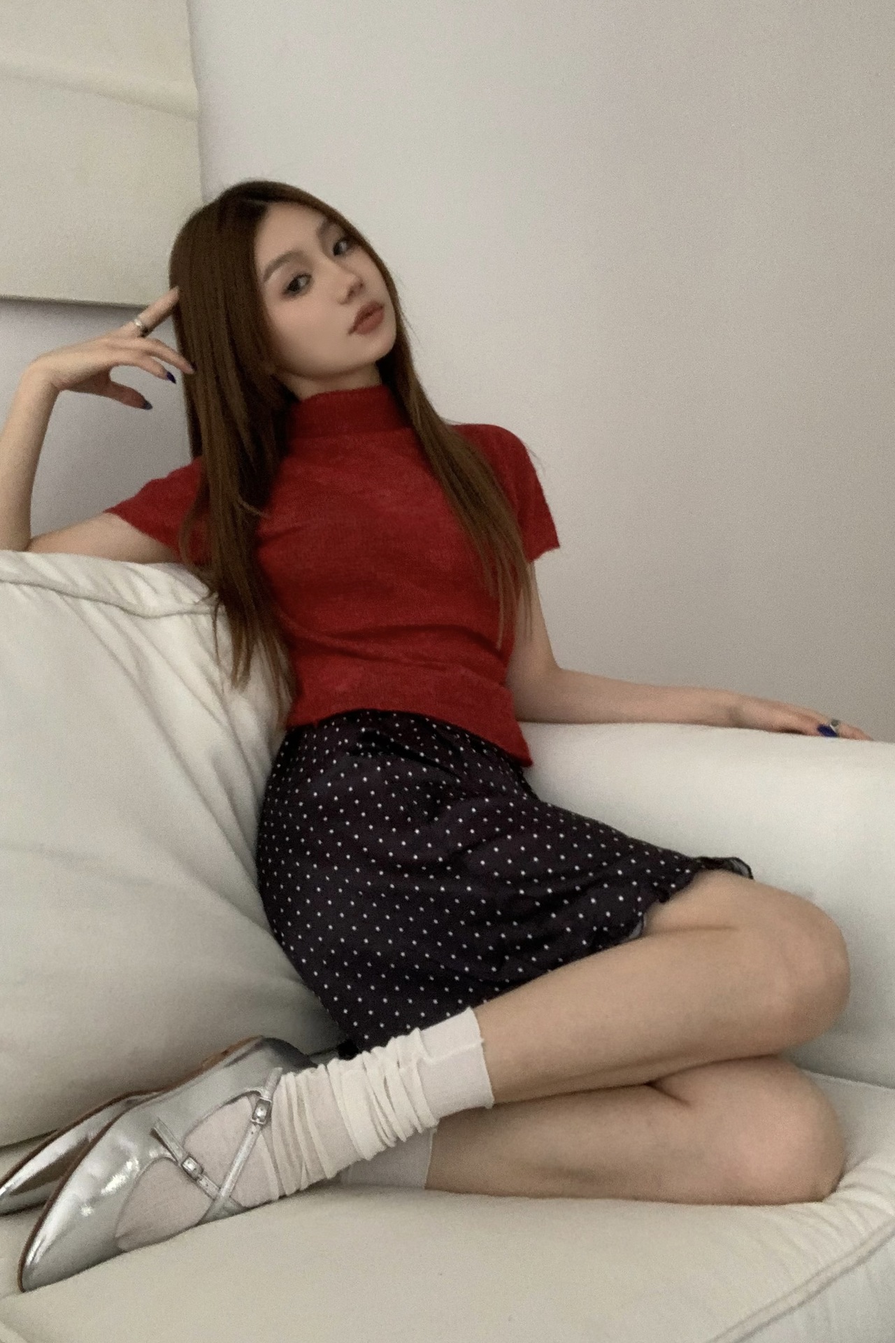 | nameOriginal | Retro half turtleneck red short-sleeved sweater spring 2024 New polka dot niche skirt two-piece fashion women |