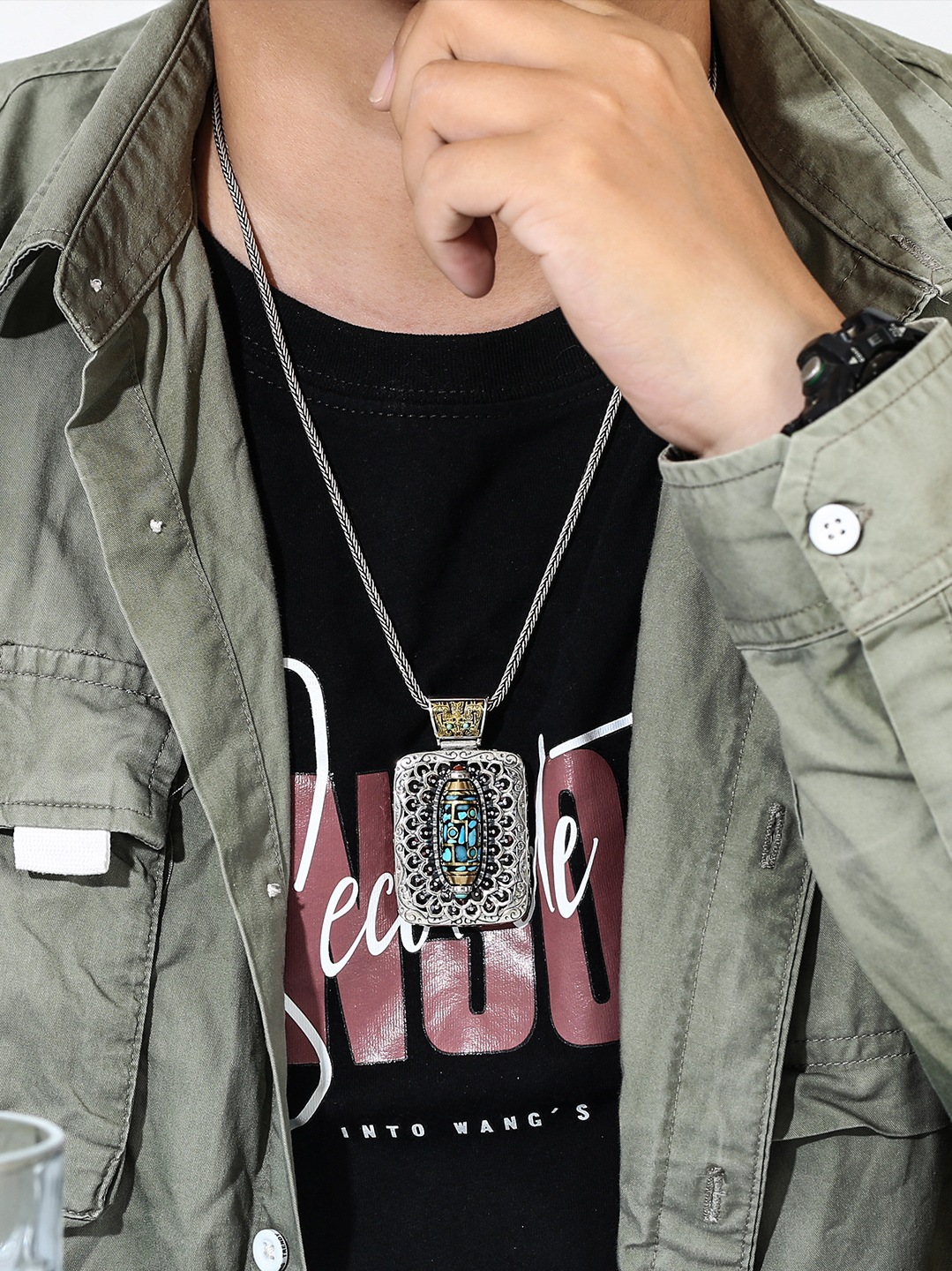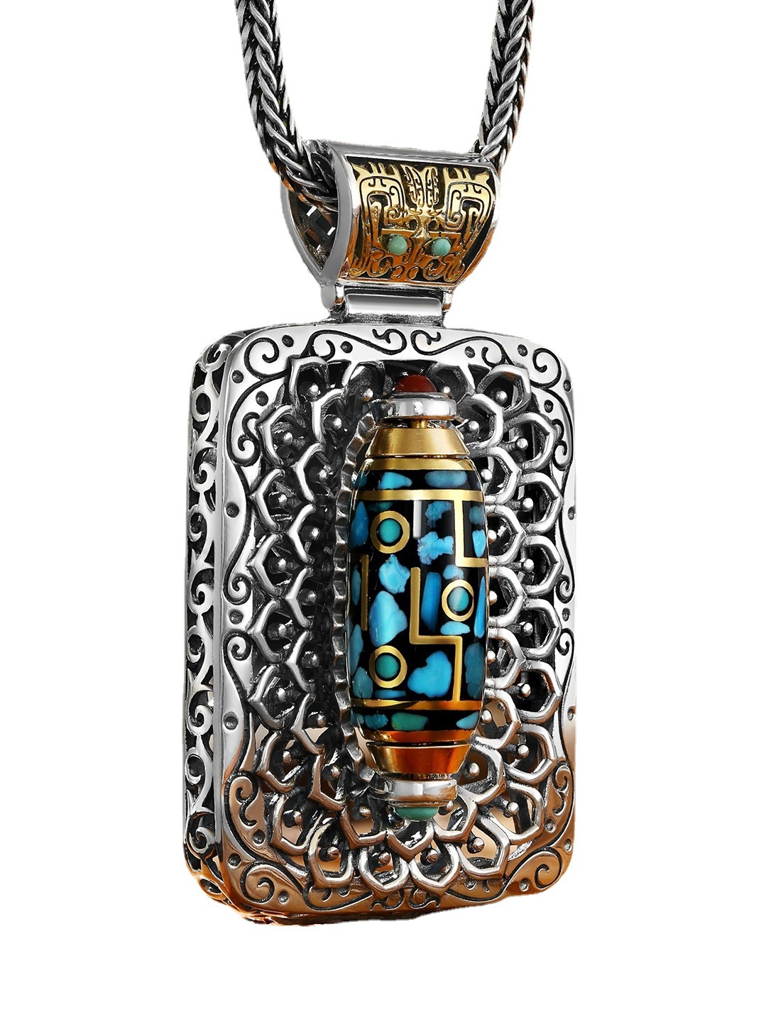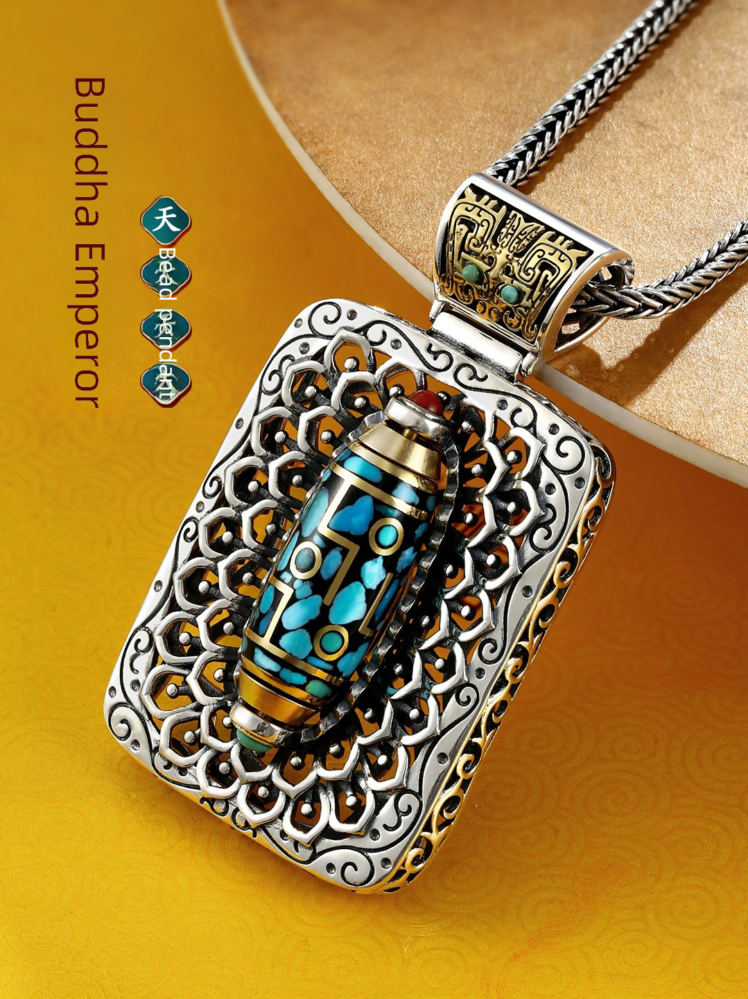 | nameOriginal | Retro high-grade Wanfo Chaozong imitation turquoise rotating beads sterling silver pendant Taotie national fashion personality men's and women's necklace |