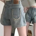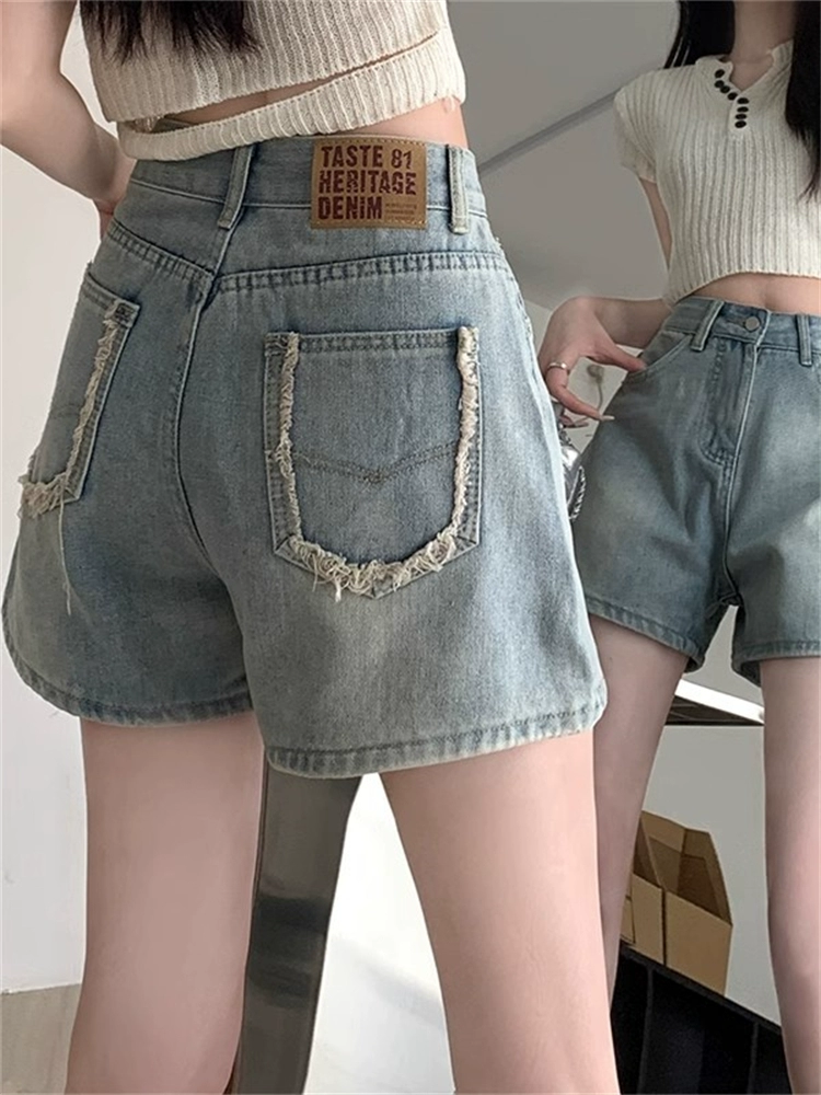 Retro high-waist raw edge A-line straight denim shorts