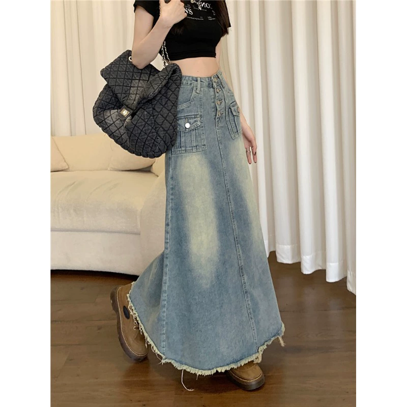 | nameOriginal | Retro high-waisted mid-length denim skirt for women summer 2024 new trendy hot girl slimming raw edge A-line skirt |