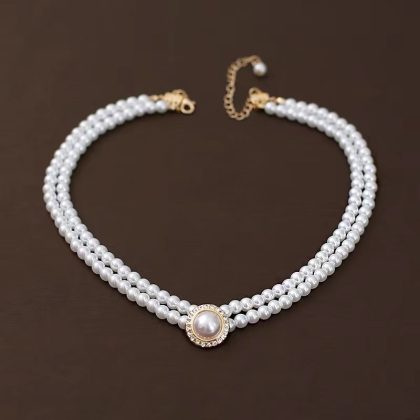 | nameOriginal | Retro Hong Kong style oval emerald Hepburn elegant French double-layer pearl necklace clavicle chain bridal earrings suit |