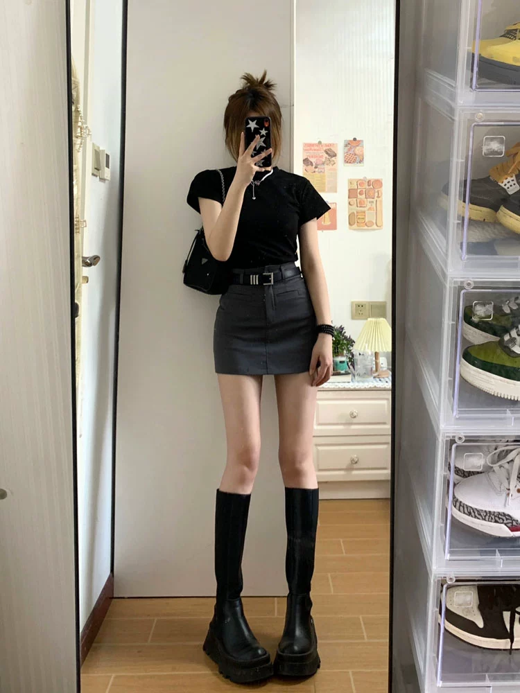 Retro Hot Girl Black Right Shoulder Slim Short Sleeve T-Shirt