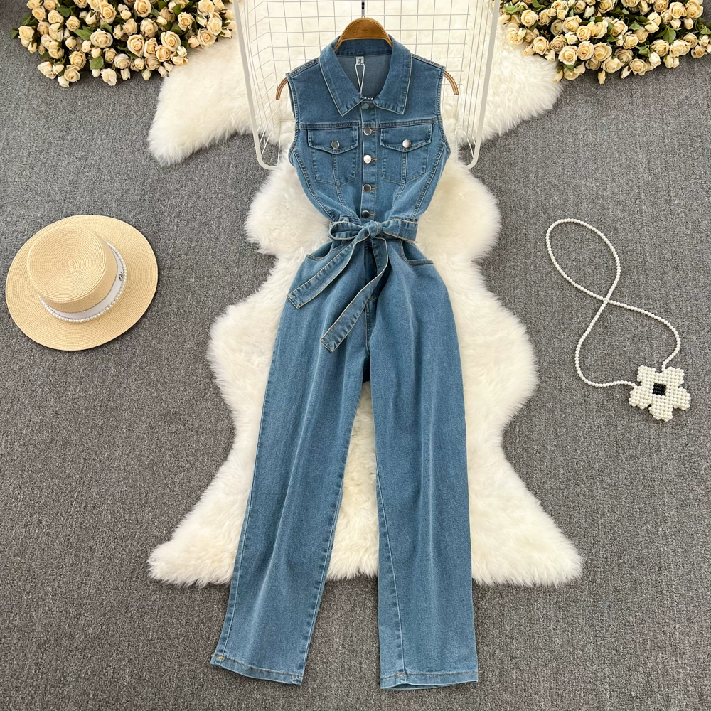 Retro Korean version of high -waisted thin straight tube denim jumpsuit