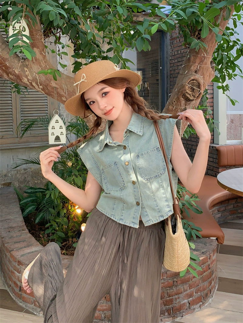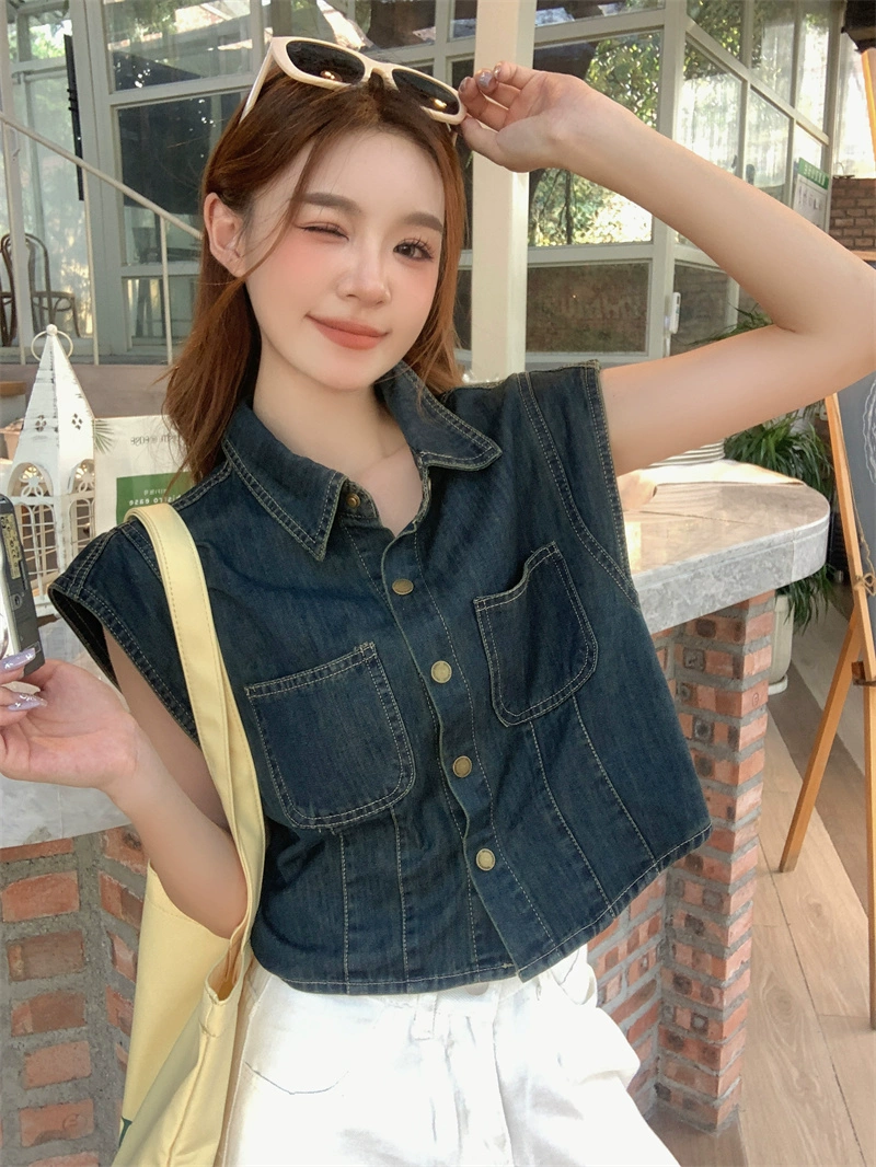 Retro lapel casual crop top denim vest