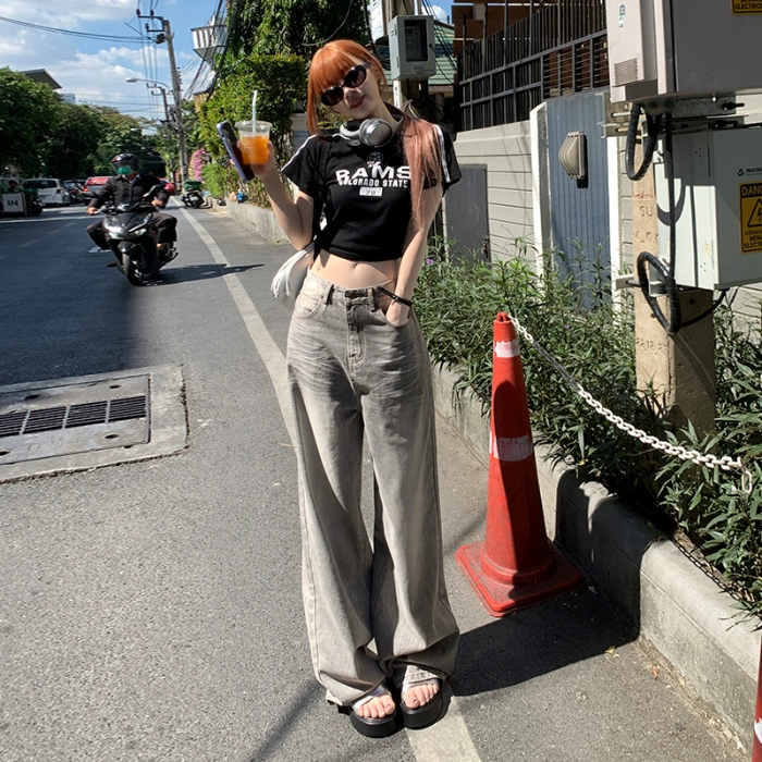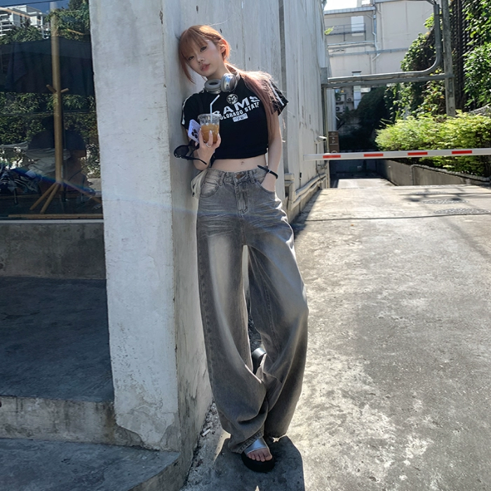 Retro light gray design high waist straight jeans